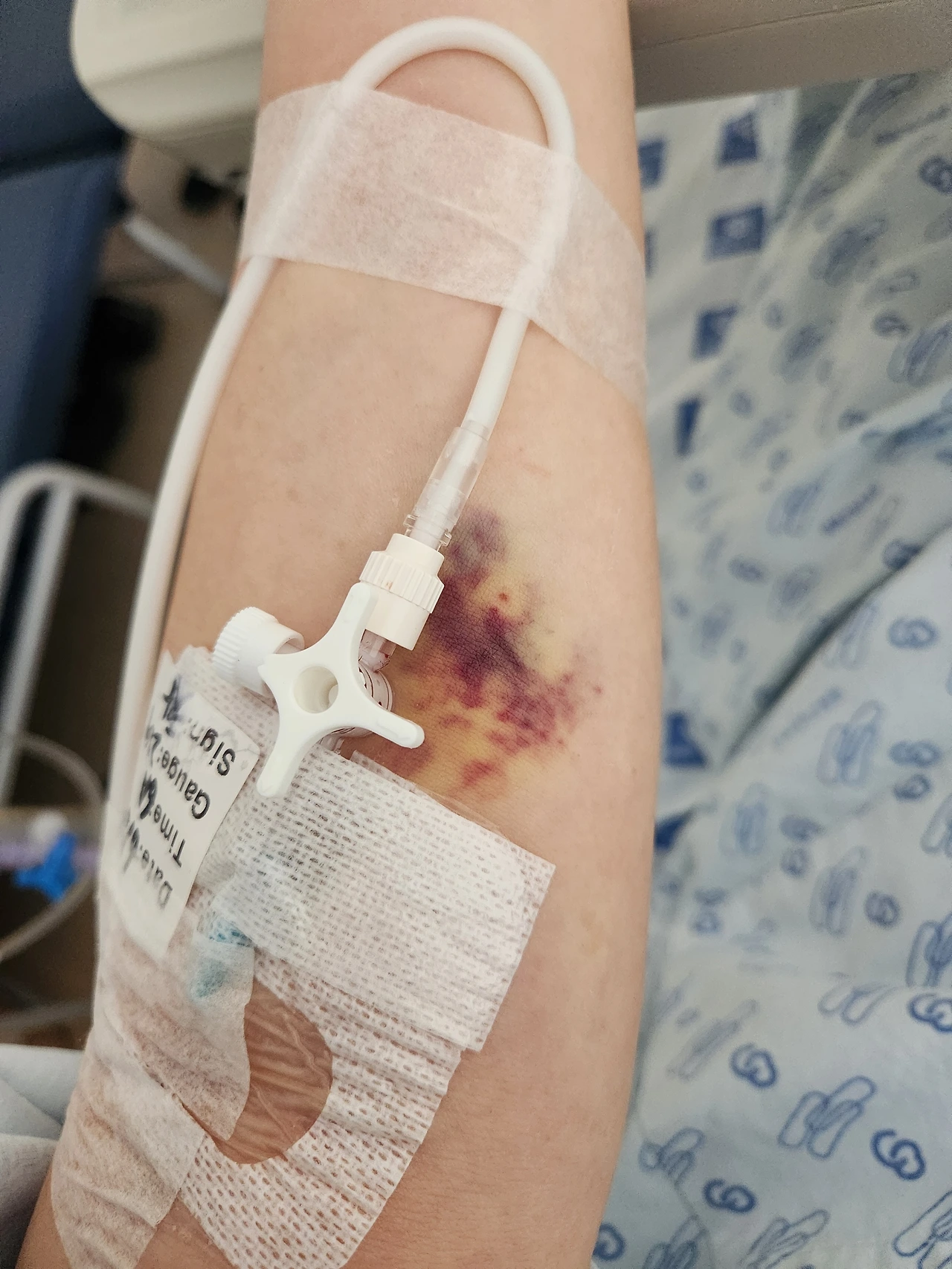 링거의 주삿바늘도 교체 기한이 있어 계속 바꿔줘야 한다. 상처투성이가 된 팔;;;; 간호사 분들은 혈관을 너무 잘 찾으셔서 한 번에 잘 주사를 꽂으셨지만 피부가 얇아 멍이 잘 들었다. 중간 검사에 CT촬영이 있어 또 큰 바늘을 꽂아야 했다. 큰 바늘 진짜 너무 싫다ㅜㅜ