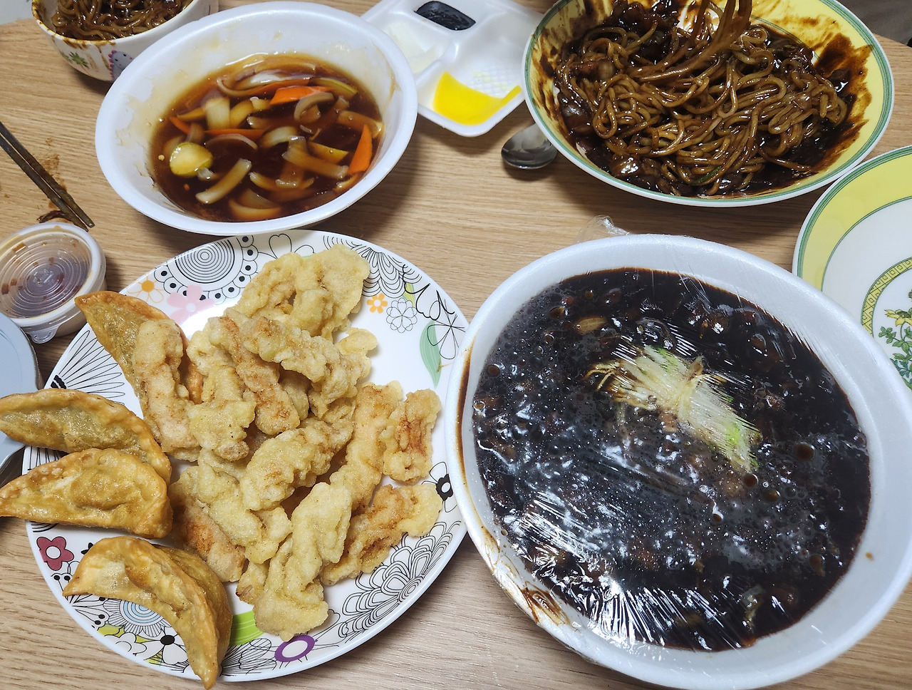 너무 맛있어 보여~~아이들이 내가 해준 음식과들 달리 와구와구 맛나게 먹는다 ㅋㅋ(너무 맛있게 먹는거 아니니) 나도 막상 보니 마음속 동요가 일어난다. 탕수육 딱 한 개만 먹어도 될까.. 짜장면 한 젓가락만 먹었으면...