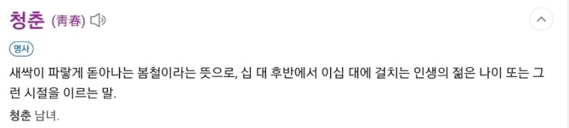 '나이가 뭐가 중요해? 마음만 청춘이면 되지!' 하며 '청춘'의 뜻을 찾아봤더니 네이버 사전이 날 나이로 후드려 팼다.