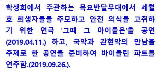 둘은 자신의 향후 진로에 대하여 성숙도가 덜하다는 인상이었습니다. 댄스를 좋아하기는 하지만 직업적인 활동으로 이어가려는 것은 아니라 하더군요. 그러면 공부도 해보지 않으련? 하고 묻고 싶었지만, 모양이 빠지는 대화 같아서 자신의 진로에 대하여도 생각해 보라는 정도로 말했습니다. 아래는 목요반달무대에서 공연한 학생의 생기부에 기재 내용입니다.
