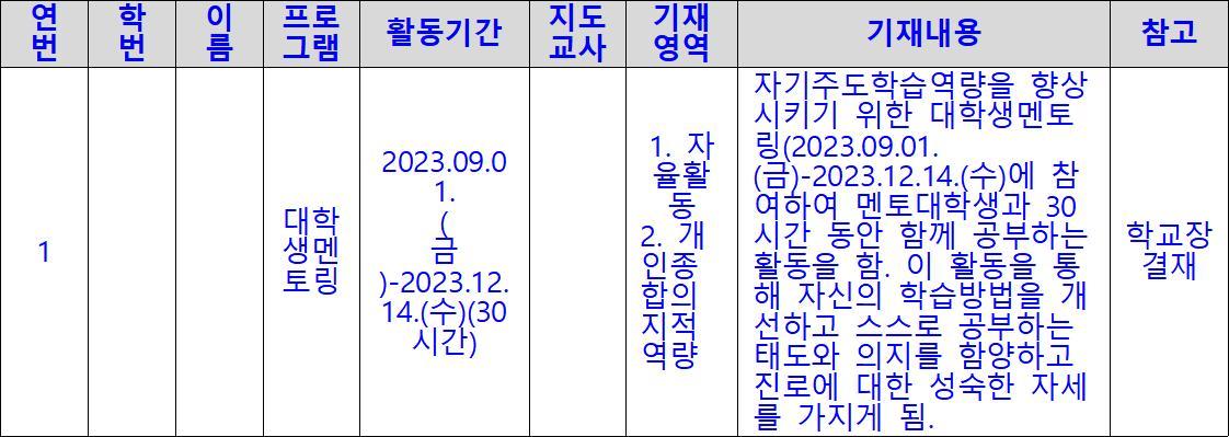 그런데 이런 활동이 모두 퇴근 후 실시되어야 하니, 대학생멘토링을 누구도 맡으려 하지 않습니다. 이런 이유로 학교에서 대학생멘토링이 이루어지기 힘듭니다. 다행스럽게 제가 근무한 두 학교 모두 이런 어려운 일을 맡아주는 선생님이 계셔서 대학생멘토링을 운영할 수 있었습니다. 정말 그 헌신에 감사하지요. 아래는 어느 해 서울대교육봉사 참여학생의 생기부 기재내용입니다.