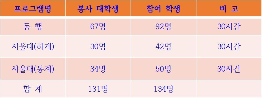 현재 실시되는 대학생멘토링 중 많이 알려진 것은 '동행'과 '서울대교육봉사' 제도입니다. 서울시가 주관하는 동행(′동생 행복 도우미′의 줄임말)은 교육봉사 대학생이 학교에 와서 30시간의 대학생 과외를 실시하는 제도입니다. 서울대학교 사범대학에서 주관하는 서울대교육봉사는 교직과정 이수 학생에게 2학기 각각 30시간씩의 교육봉사가 필수로 지정되어 운영되는 제도입니다. 두 제도를 동시에 운영하다 보면, 학생들이 서울대교육봉사를 선호하여 대학생과 재학생 매칭 시 약간의 곤혹스러움을 느끼곤 했습니다. 우리나라에는 여러 방면에서 서울대병이 있는 것 같습니다! 위 표는 어느 해 실시한 대학생멘토링 현황입니다. 무지하게 많이 했지요!