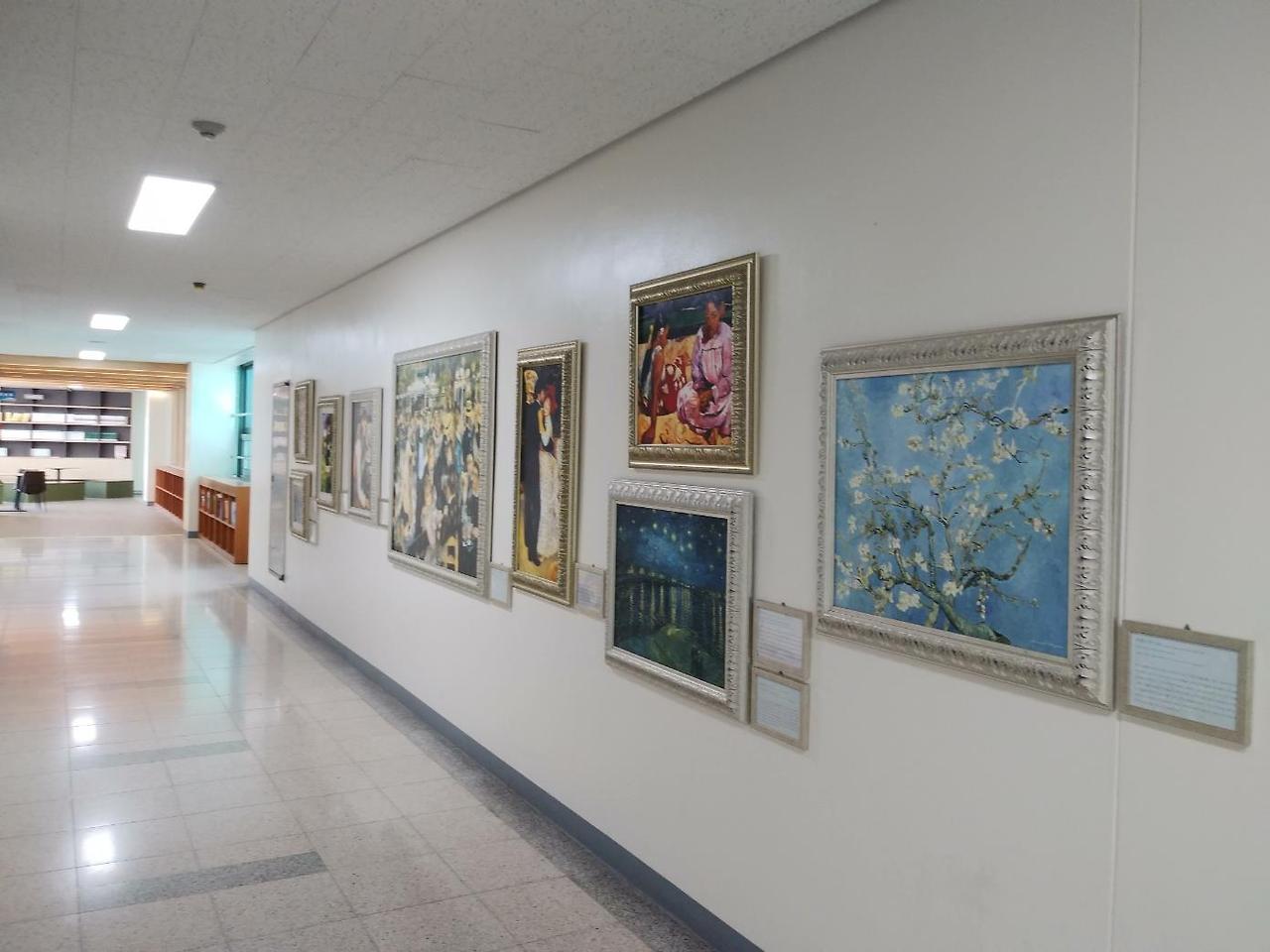 복도갤러리는 학교의 빈 벽면에 복제된 명화를 게시하는 것입니다. 복제 명화를 판매하는 곳이 몇 군데 있습니다. 교장이 되어서도 교육청 공모사업을 신청하여 예산을 확보한 후 복도갤러리를 설치했습니다.우수 업체를 수소문하여 몇 가지 요구를 하였습니다. 미술 분야에 관심이 있는 학생들의 참여와 이들에 대한 교육을 해 줄 것과, 미술사 시대별로 1층부터 4층까지 작품을 전시할 것, 그리고 전시된 작품에는 약간의 작품 소개 글을 부착하도록 했습니다. 다행히도 업체에서 성실하게 약속을 지켜주어 제 나름 만족할 만한 설치가 되었습니다. 위 사진은 복도갤러리 일부 사진입니다.