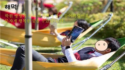 잘난 체 하나 더요! 학교 중앙정원에 해먹을 설치하고자 했습니다. 학생들이 점심시간이나 방과후에 해먹에 누워 독서를 하든가 멍때리며 쉬게 하고 싶어서요. 쫌 어색하지요? 주위의 반대에 부딪혀 일단 2개를 설치하는 것으로 타협을 했습니다. 저는 일단 설치하고 나면 학생들이 좋아하여 더 설치할 수밖에 없을 거란 예상을 하고요. 물론 반대하는 분들은 사용자가 없어 학교장이 창피해 할 거라고 예상했겠지요. 난리가 나더군요! 학생들이 쉬는 시간마다 서로 해먹에 누워보려고 정원에 뛰쳐 내려와서요. 두 달쯤 후에 2개를 추가로 설치했습니다. 짜식들! 처음부터 학교장 말을 듣지! ㅎㅎㅎ… 사진에 문구가 들어있는 것은 홈피 대문사진에 올리면서, 본교는 여유와 멋을 지향한다는 메시지를 알리기 위해 넣은 것입니다.