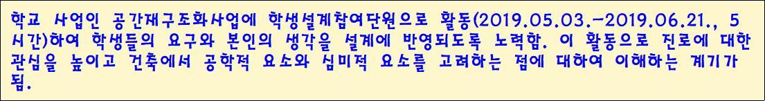 건축 분야 진로 희망 학생을 대상으로 학생설계참여단을 구성하여 5시간의 활동을 한 후 아래와 같은 내용을 생기부에 기재해 주었습니다. 참여단 중에 그해 서울대 건축학과에 진학한 학생이 있어 다들 놀랐습니다. 재미있는 상황이 있더군요. 담임교사는 담임 지도를 잘하여, 동아리 지도교사는 동아리 지도를 잘하여, 하다못해 1학년 때 담임은 1학년 때 기초를 다지도록 하여 서울대에 진학했다 주장을 하더군요. 제 생각은 학생설계참여단 활동을 조직하고 활동 내역을 생기부에 기재한 것이 합격의 큰 이유가 아닌가 하고 생각했습니다(주장은 안 했습니다!). 글쎄… 건축학과 지원자 중에 이런 내용이 생기부에 기재된 학생이 있기 힘들겠지요?