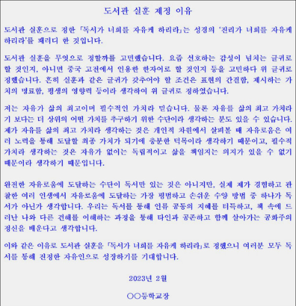 도서관 실훈을 ‘독서가 너희를 자유케 하리라’로 정했습니다. 제가요! 왜 이런 실훈을 정했는가를 알릴 필요가 있어 아래와 같은 글을 인쇄하여 실훈 밑에 부착하고 학교를 떠났습니다. 대게 이런 실훈은 조금만 시간이 지나도 그냥 잊혀지고 아무도 유래를 모르는 경우가 많지요. 아직도 제가 붙인 안내글이 붙어있나 모르겠습니다. 본드로 붙일 걸 그랬나! ㅎㅎㅎ…