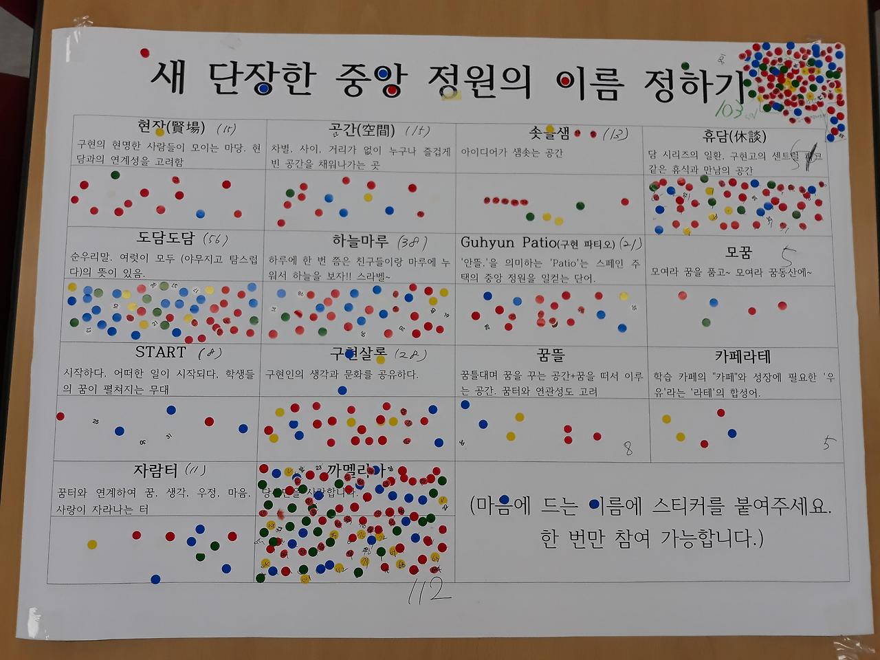 통합공간의 이름을 정하는 것을 학생과 교직원의 투표로 정하고자 했습니다. 상금으로 10만 원을 걸고요. 저도 현장(賢場)이란 이름으로 응모를 했습니다. 그림에서 보시는 것처럼 참패를 했습니다. 사람들이 야속해요! 교장의 제안에 지지를 보내줘도 좋으련만! 1등으로 뽑힌 까멜리아는 당시 인기드리마에 나오는 이름인데, 이 이름이 갖는 성적인 함의를 얘기하는 분이 있어 할 수 없이 2등인 휴담(休談)으로 정했습니다. 1등 제안한 분이 많이 서운해해서 상금은 그분께 드렸습니다. 나중에 제 제안인 현장(賢場)이 왜 선택되지 않았는가를 알아보니, ‘노가다’란 이미지가 떠올라 싫었다 하더군요. 사실, 저는 그런 이유로 이 이름을 선정하고 싶었었는데…. 또 이미 교사용 휴게공간 이름을 현담(賢談)으로 정하고 있어, 현담이란 이름의 대응으로서도 현장(賢場)이 더 타당한데… ㅠㅠㅠ...