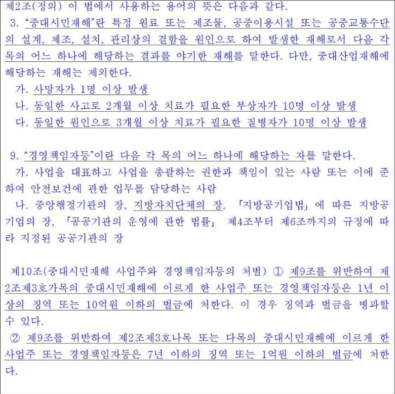 부연 설명을 드립니다. 제2조 3항은 ‘중대시민재해’의 정의와 중대시민재해 해당 사건을 설명합니다. 제9조는 중대시민재해가 발생했을 때 누가 책임을 지느냐에 대한 것으로, 법에서는 ‘지방자치단체의 장’ 즉, ‘교육감’이 책임을 진다는 것입니다. 그렇다고 학교장이 만세를 부를 일은 아니겠지요. 당연한 이야기지만, 교육감의 지휘‧감독을 받는 학교장은 해당 학교에서 중대시민재해가 발생했다면 행정적 책임이나 구상권으로부터 자유로울 수 없을 것 같습니다. 뭐… 그래도 제10조에서 말하는 징역이나 벌금형 대상은 아니니 다행이긴 하네요. 저렇게 무시무시한 책임을 질 수 있는 교육감을 하려는 사람이 많다는 현상도 특이하기는 하네요!