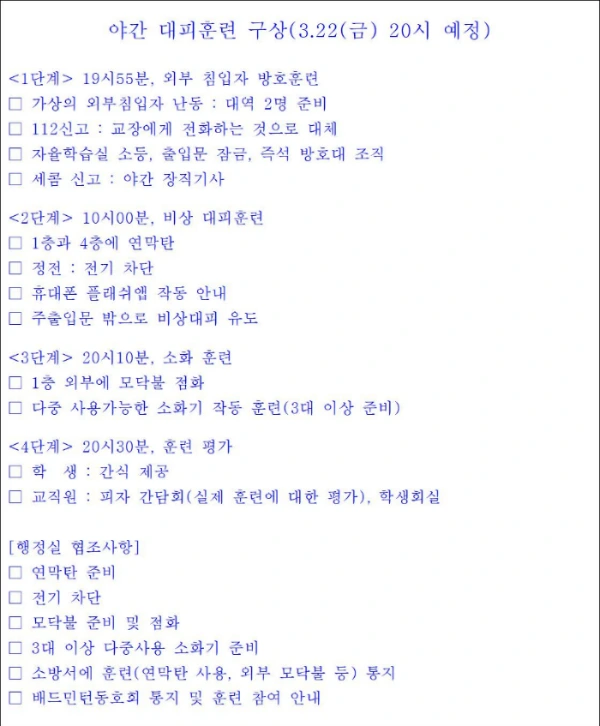 또 하나 걱정되는 상황은 정신이상 외부인이 야간에 건물 내로 침투하여 이상한 행동을 하는 사태였습니다. 물론 화재사고도 걱정이 되고요. 제 결정으로 매년 야간비상대피훈련을 실시했습니다. 제 결정이란 의미는 국가에서 실시하는 주간의 민방위 대피훈련과는 별도로 본교에서 실시하는 훈련이라는 의미입니다. 아래는 야간비상대피훈련이 어떤 방식으로 어떤 내용으로 이루어지는가를 설명하는 자료입니다.