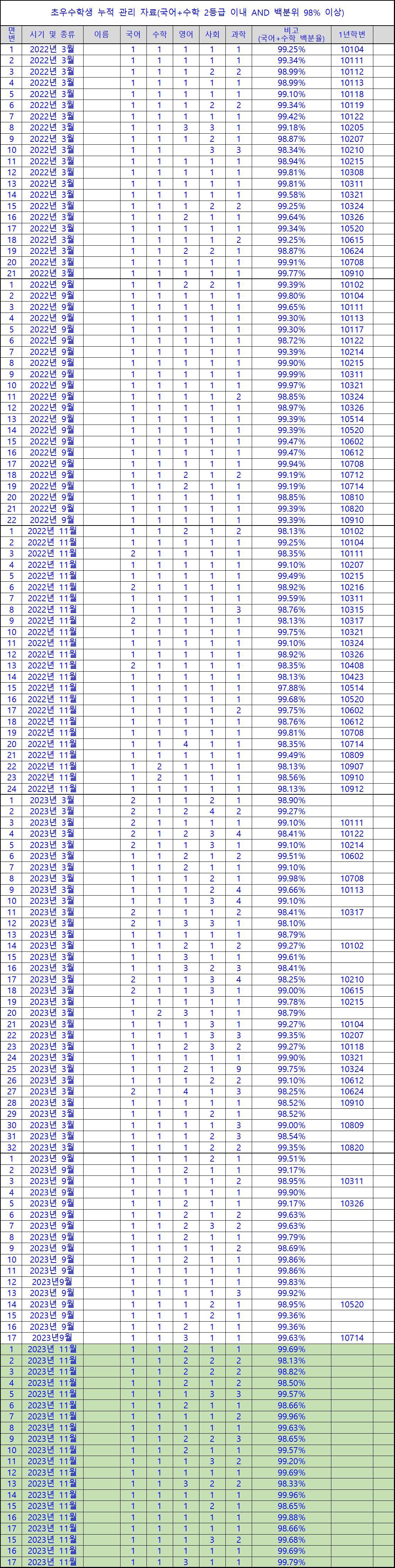초우수학생 격려 행사에서는 다음과 같은 얘기를 주로 하곤 했습니다. ‘여러분이 더욱 분발하여 전국적인 순위를 높여야만, 여러분을 지켜보는 급우들도 여러분을 따라 열심히 공부하여 다 함께 성장할 수 있다. 공부라는 것이 나 자신을 위한 것임에는 분명하지만, 나의 노력이 친구들을 분투케 하여 친구들을 도울 수 있는 행위라는 점에서 공부의 훌륭함이 있는 것이 아닌가 한다. 또한 오늘의 결과가 여러분의 노력만이 아닌 다양한 측면에서의 행운임을 이해한다면, 겸손하게 행동하고 학업태도 측면에서는 모범을 보여 모두가 최선을 다하는 학교가 되는데 기여하기를 바란다.’ 라고요. 아래는 교장실에 초청된 2학년 초우수학생 자료입니다.