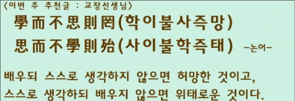 두 번째 학교에 부임하여 보니 학생들이 점심시간에 줄을 서서 기다려 식사를 하더군요. 식당에 입실하기 전 몇 분간의 시간을 어떻게 유용하게 활용할까 생각하다가, 식당 입구에 전자게시판을 설치하고 1주일에 한 편씩의 교훈글을 게시했습니다. 식사 전의 그 짧은 시간마저 학생들을 그냥 놔두지 않는 잔인한(?) 조치란 생각도 들지만, 식사 전에 가볍게 생각해 볼거리를 제공한다는 정도로 생각했습니다. 교훈글의 내용은 선생님들 공모를 받아 제가 선정하여 제시했습니다. 이런 경우 곤란한 점은 협조하는 분이 적다는 사실보다도 제출된 교훈글 중 선정하지 않는 것이 있을 때, 그 글을 제출한 분에게 미안한 것이지요. 뭐… 그래도 꿋꿋하게 제가 정한 기준에 맞는 교훈글을 게시하곤 했습니다. 아래는 제가 올린 첫 교훈글입니다. 저는 교육활동에서 이 글귀를 늘 되새기곤 합니다.