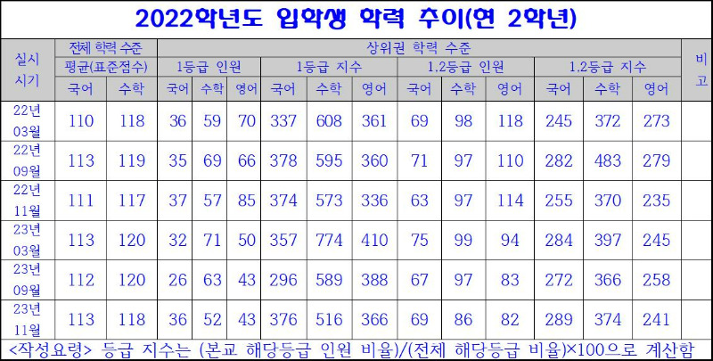 예를 들면 디비피아 접속률의 변화 추이, 신입생 출신 중학교의 변화 추이, 전국연합학력평가별 초우수학생 명단 및 성적변화 추이 등입니다. 아래의 첫 번째 자료는 전국연합학력평가 결과 분석 자료입니다. 본교의 평균적인 성적 수준과 우수 학생 비율 및 교과목별 본교 학생의 강점과 약점 등을 파악해 볼 수 있는 자료입니다. 두 번째 자료는 본교 논술고사 결과 데이터입니다. 제발이지 이 데이터를 보고, 합격가능성이 있는 학생들만 수리논술에 지원했으면 했지만, 시극지 학생들이 말을 듣지 않더군요.
