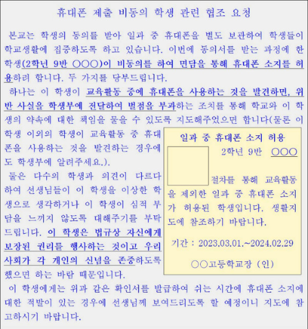 본교에서는 일과 중에는 휴대폰을 제출하도록 학생들을 설득하고, 실제로 ‘일과 중 휴대폰 제출하기’ 운동을 실시했습니다. 학부모와 선생님들은 적극 찬성하지만, 학생 중에는 학생인권 등을 언급하며 반대하는 경우도 있더군요. 이런 상황에서 학교가 휴대폰 제출 비동의 학생에게 휴대폰 소지를 허용한다 하고는, 다른 방향에서 해당 학생을 불편하게 하면, 이는 학교의 품격에도 어긋나고 학생에게 사회제도와 학교의 지도에 대한 불신을 키워주는 것이라 생각했습니다. 저는 해당 학생을 교장실로 불러 면담과 당부를 하고 휴대폰 소지 허락서를 코팅하여 주고, 선생님들께는 아래와 같은 당부의 메시를 보냈습니다. 우리 세대가 어떻게 성장했든, 자라나는 세대는 당당하게 성장하게 해야 한다는 당위에 의한 결정으로 이해했으면 했습니다.