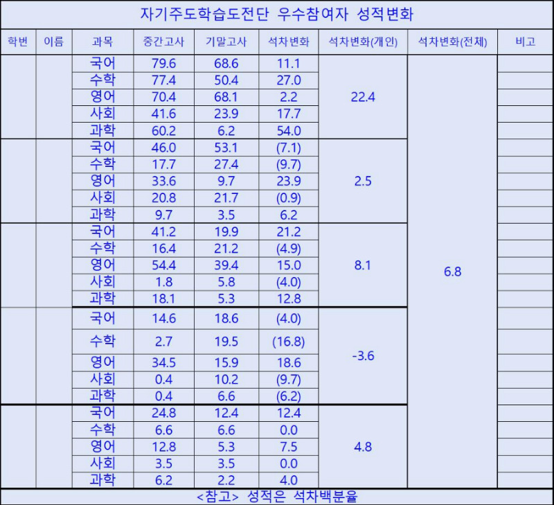 그래도 틀린 판단을 안 바꾸면 어찌하냐고요? 그런 상황에서는 비교형량이란 단어를 생각했습니다. 시국지 선생님의 생각을 바꾸게 강압을 가했을 때, 그분이 입게 될 굴욕감과 학교가 얻는 교육적 성과 중 어느 것이 더 클까를 비교합니다. 저는 전자의 무게를 많이 느꼈습니다. 아래는 자기주도학습도전단 활동이 갖는 교육적 성과를, 활동에 협조적이지 않은 시국지 선생님들이 깨달았으면 하여 공유한 자료입니다.