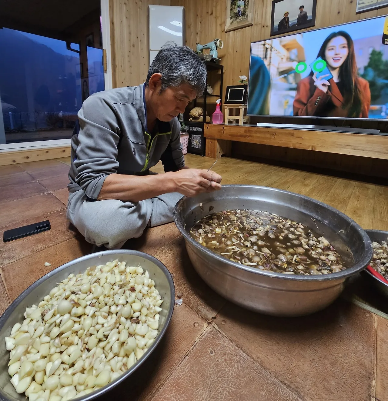 부부는 작은 칼을 손에 들고 텔레비전 앞에 마주 앉았다. 그리고 한 알 한 알 마늘을 까기 시작했다.
