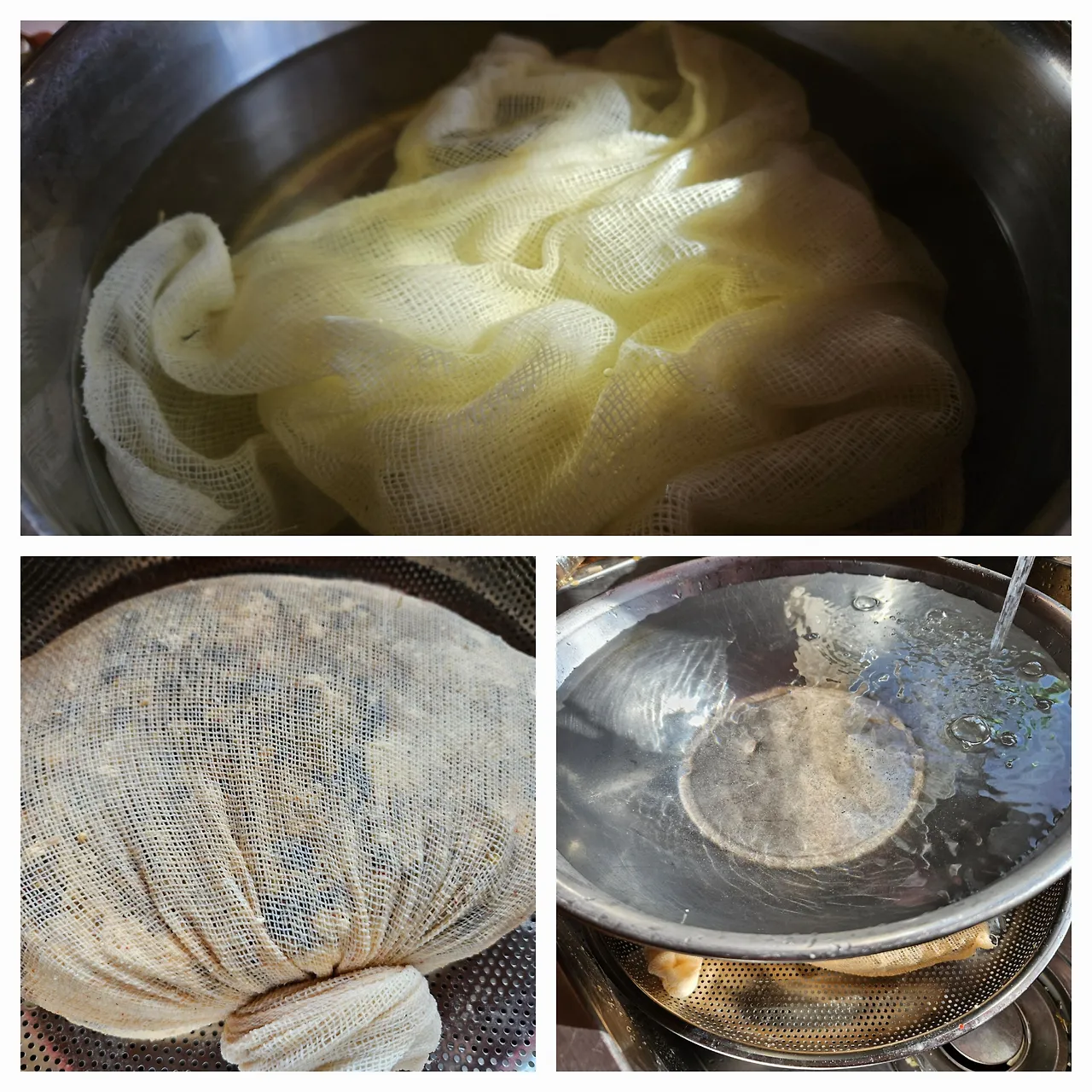 나는 작업실로 들어가 원단산 밑에 깔려 있는 삼베를 꺼냈다. 대충 크기를 가늠해 가위로 잘랐다. 재봉틀로 드르륵 박아 자루를 만들었다. 이럴 때마다 내 바느질 취미가 아주 유용하게 쓰였다. 급하게 만든 자루를 삶아 다진 재료를 넣었다. 예전에 엄마는 맷돌을 올려서 물기를 뺐는데 난 양푼에 물을 가득 받아 올려놓았다.