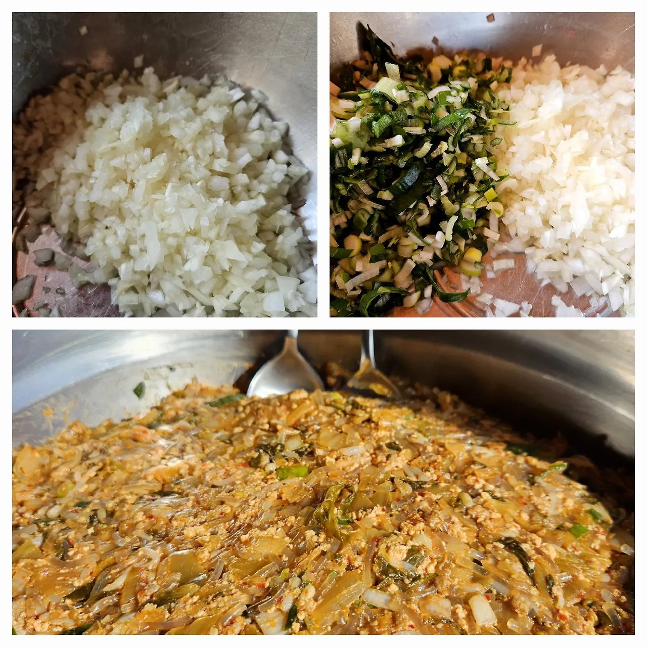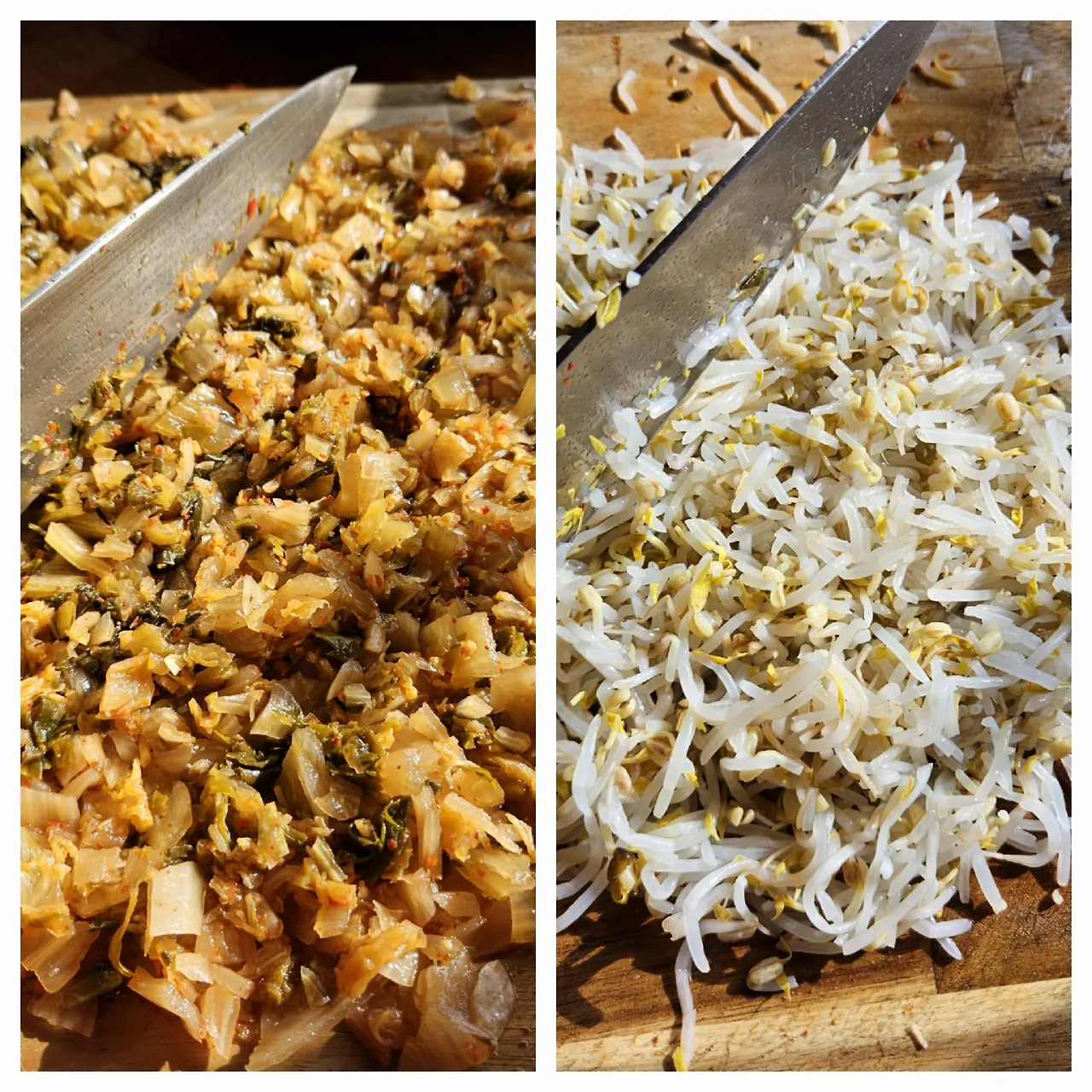 물기가 빠지는 동안 다른 재료를 준비했다. 만두소를 만드는 일은 다지는 일의 연속이다. 지난밤에 불려 둔 당면은 친구가 보내준 맛간장으로 간을 해서 들기름에 볶아 다졌다. 양파와 대파를 다졌다. 엄마는 무나물을 만들어 다져 넣었는데 나는 미처 준비하지 못했다. 간 돼지고기도 후추와 맛간장을 넣어 볶았다. 그러는 사이 다진 김치에 물기는 적당히 빠졌다. 양푼에 모든 재료를 넣고 마늘과 고춧가를 더해 소금으로 간을 했다. 계란 몇 개 깨 넣고 들기름(난 참기름보다 들기름을 선호한다.) 휘휘 둘러 골고루 버무렸다.