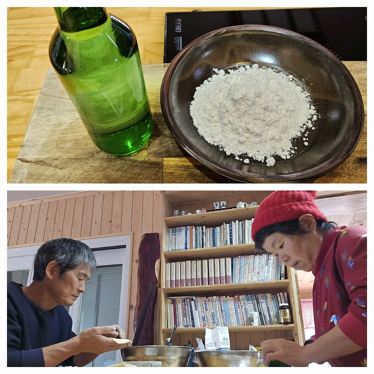 준비된 재료를 식탁에 두고 자리를 잡았다. 홍두깨 대신으로 소주병에 물을 채웠다. 물에 무게로 인해 힘들이지 않고 피를 쉽게 밀수 있다. 내가 피를 밀어 남편에게 건네면 남편은 그것을 받아 만두를 빚었다