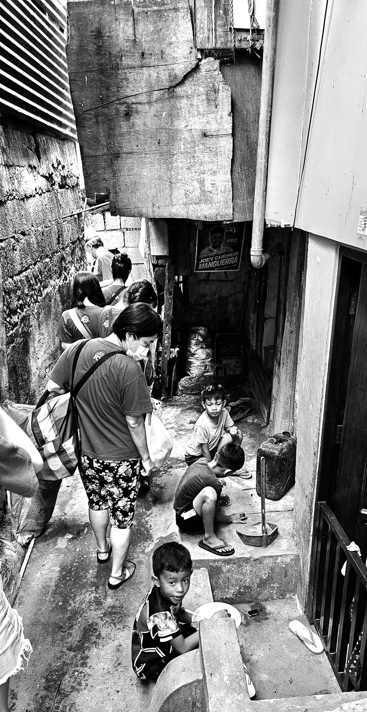 점심을 먹고 마트에 가서 마을 사람들에게 나누어 줄 장난감과 과자와 쌀을 구입했다. 선교사가 제공해 준 지프니를 타고 빈민촌이라 불리는 카나아스 마을에 도착했다. 우리를 기다리고 있던 선교사는 언덕에 있는 큰길을 가운데 두고 높은 곳은 부촌이고 아래는 빈민촌이라고 설명했다.