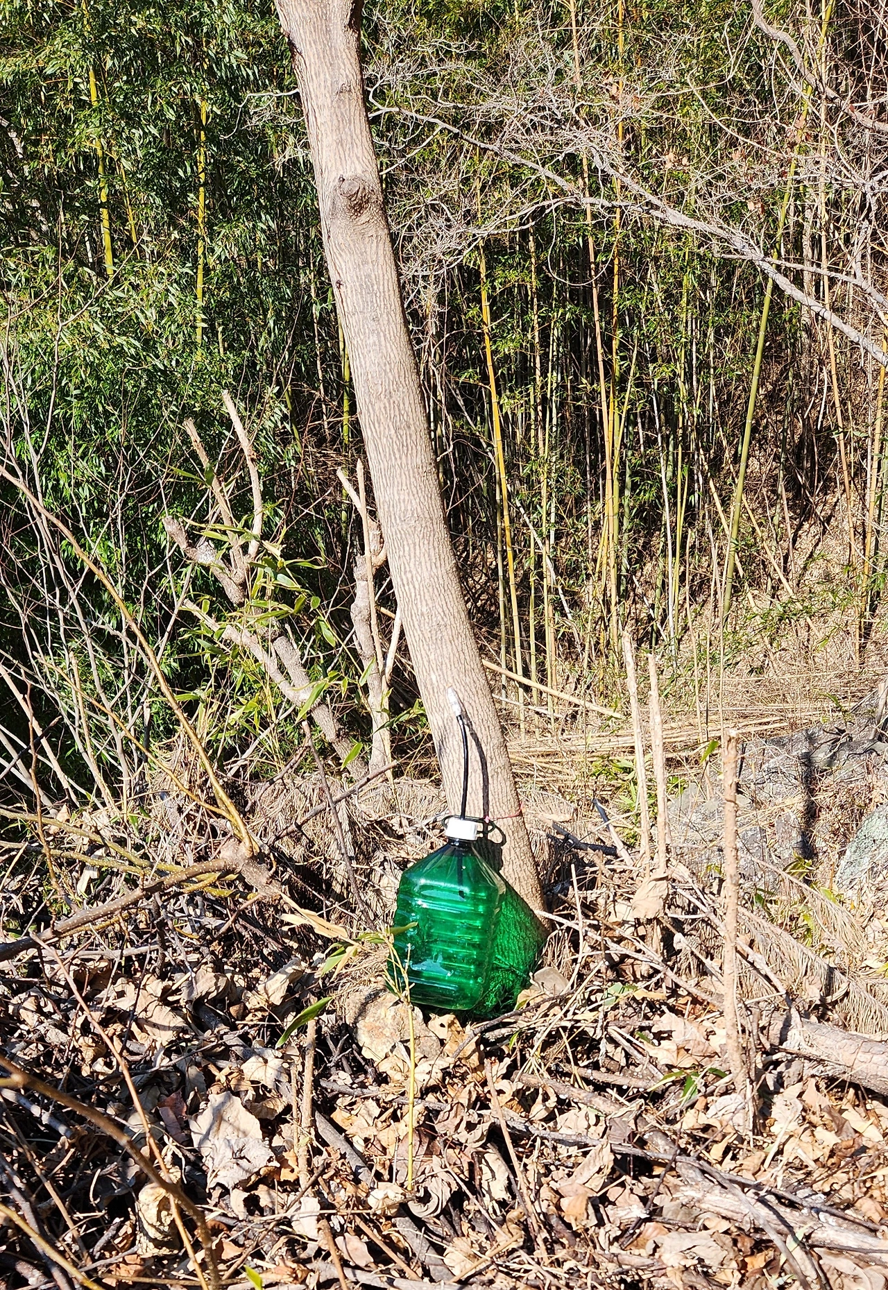남편 옷을 만드는 중이라 입혀 보려고 나와 보니 남편이 보이지 않았다. 다시 들어가 바느질을 하고 있는데 진동으로 해 놓은 핸드폰이 부르르 몸을 떨었다. 열어보니 고로쇠나무에 녹색 물통이 매달려 있는 사진이었다. 나는 '헐! 벌써?'라고 쓰고 놀란 표정의 이모티콘을 보냈다.