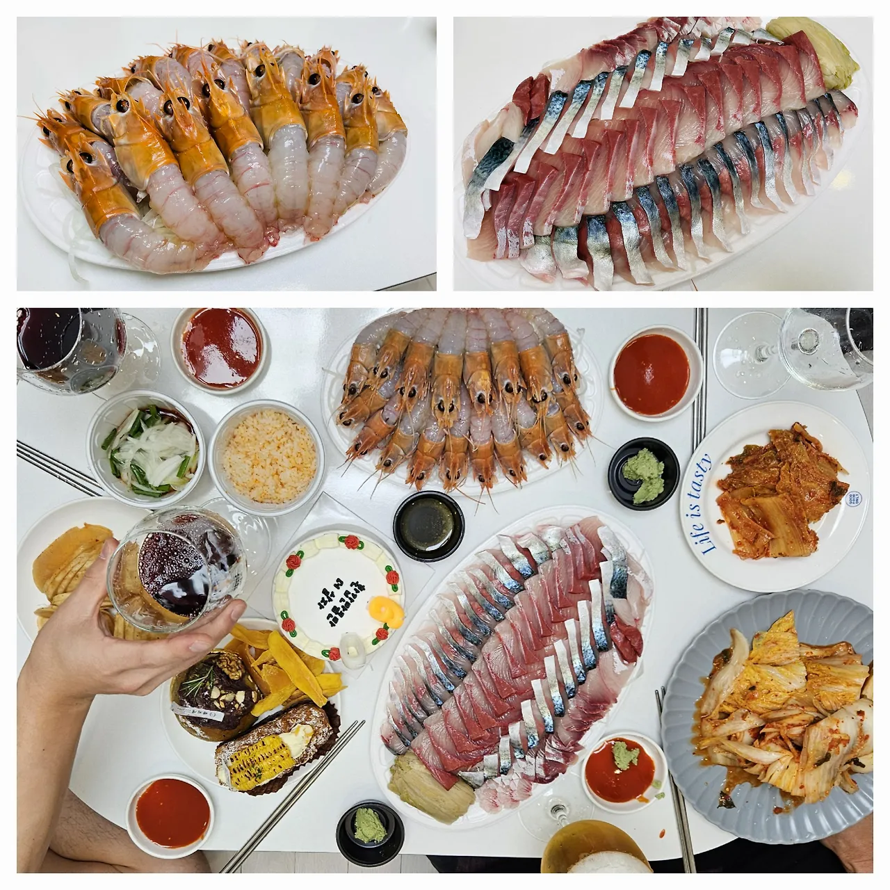 숙소에 도착해 한잠 자고 일어나 퇴근하는 작은아들 데리러 갔다. 저녁을 먹어야 하는데 밖에서 먹으면 누구 한 명은 운전 때문에 술을 마시지 못한다. 각자가 먹고 싶은 회를 포장해서 숙소에 가서 먹기로 했다. 나는 고등어. 남편과 큰 아들은 딱새우, 작은아들은 방어를 선택했다.