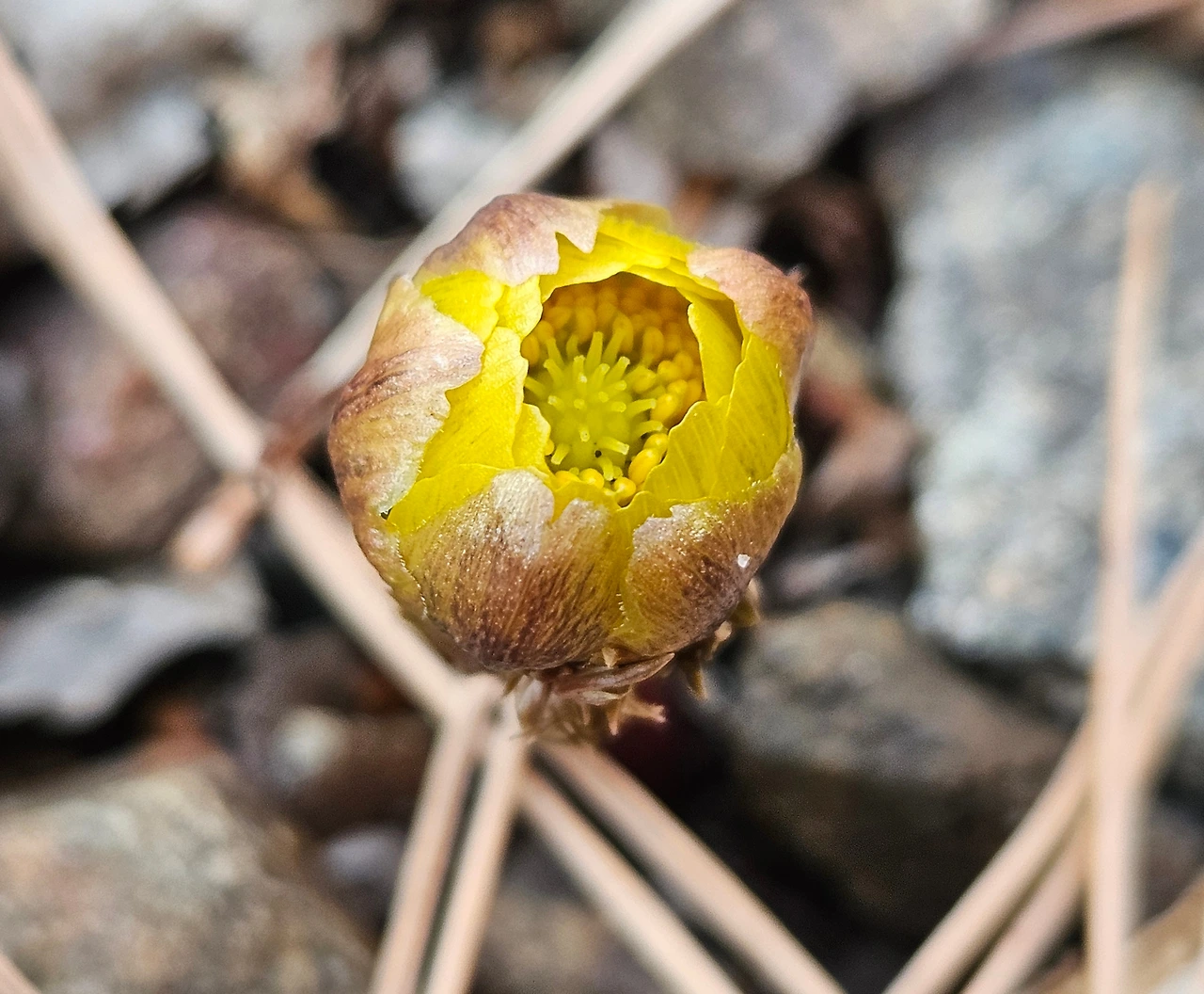며 칠 전, 지인에게서 이방산에 노란 얼음새꽃이 피고 있다는 소식이 왔다. 소식을 들은 나는 이방산으로 달려갔다. 이방산의 얼음새꽃은 이제 막 고개를 내밀기 시작했다.