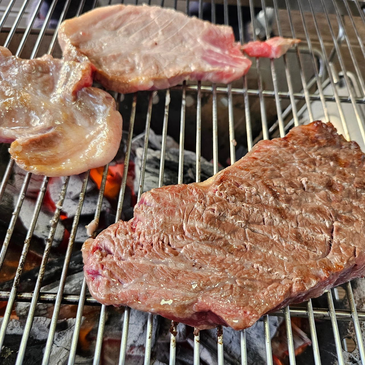 모든 재료를 준비해서 쟁반에 담아 들고 마당으로 나왔다. 남편은 어느새 숯불을 피워 고기를 구우며 캠핑 분위기를 내고 있었다. 석쇠 위에서 자글자글 익어가는 고기의 색깔은 내가 좋아하는 소고기다. 그 옆에는 남편이 먹을 돼지 목살이 얌전하게 올라 앉아있다.