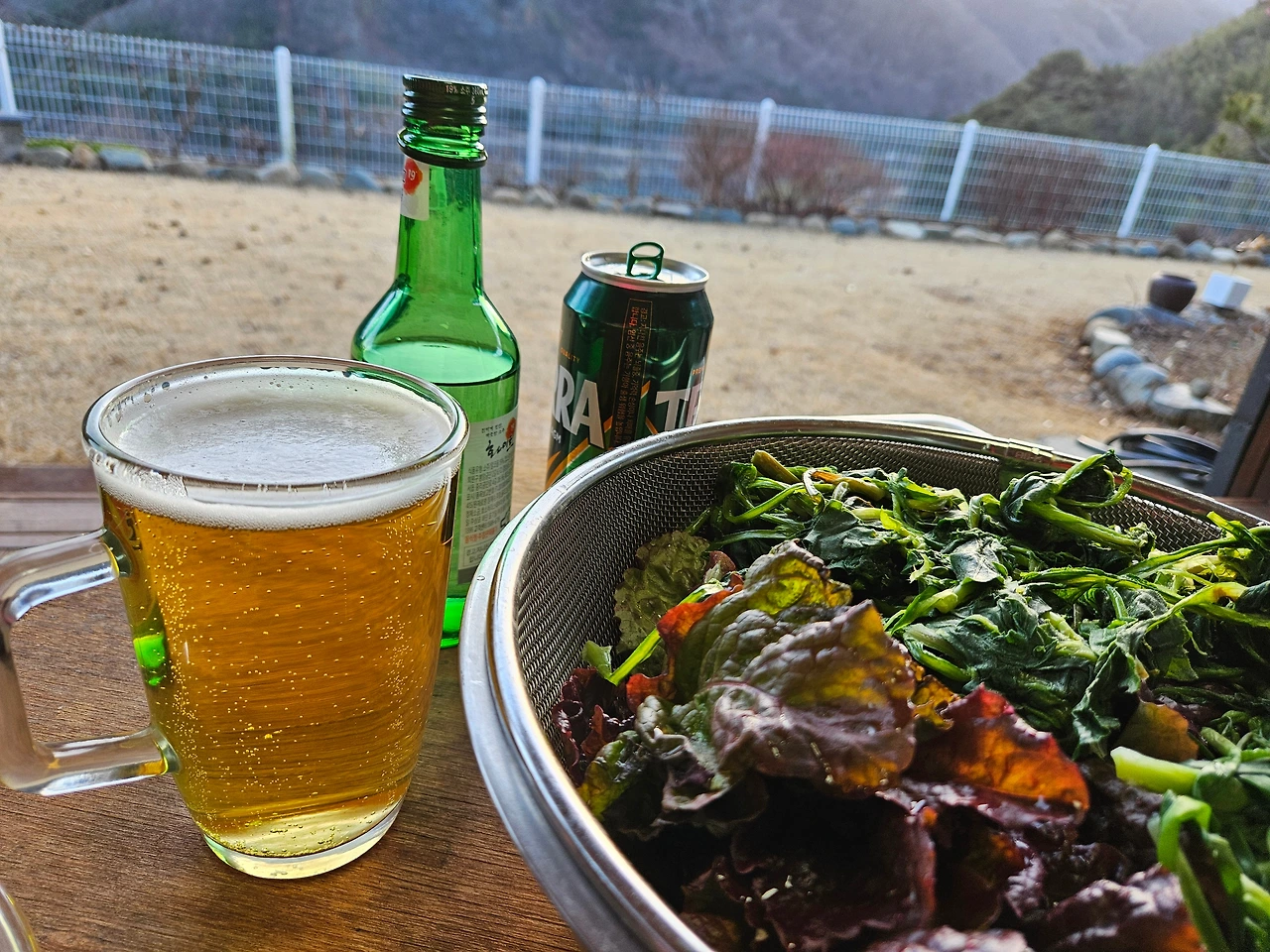 상추에 고기와 부지깽이나물을 싸서 입안 가득 채웠다. 맥주 한 모금 넘기니 고소한 맛은 입안을 돌아다니고 고기는 스르르 목구멍을 타고 내려갔다.