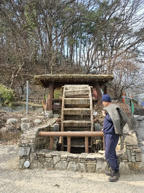 이어지는 개울 길을 따라 다리를 건너서 다시 주차장으로 돌아왔다. 주차장 길 건너에는 형태를 잃고 있는 물레방아가 있다. 그 물레방아는 남편이 귀촌 초창기, 그러니까 12년 전에 일당 8만 원을 받으며 손을 보탠 것이다.