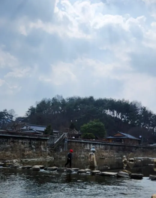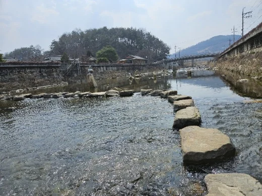 나온다. 개울 곳곳에 돌을 쌓아 놓은 풍경 또한 오후의 햇살과 어우러져 이색적이 풍경이다. 총총총 징검다리를 건너면 널찍한 주차장이 나온다. 그곳에는 키가 큰 그네가 있다. 그네를 타며 개울 건너 예담촌 마을을 둘러보며 살랑거리는 봄바람을 날려 보내는 재미를 느껴 보시라.