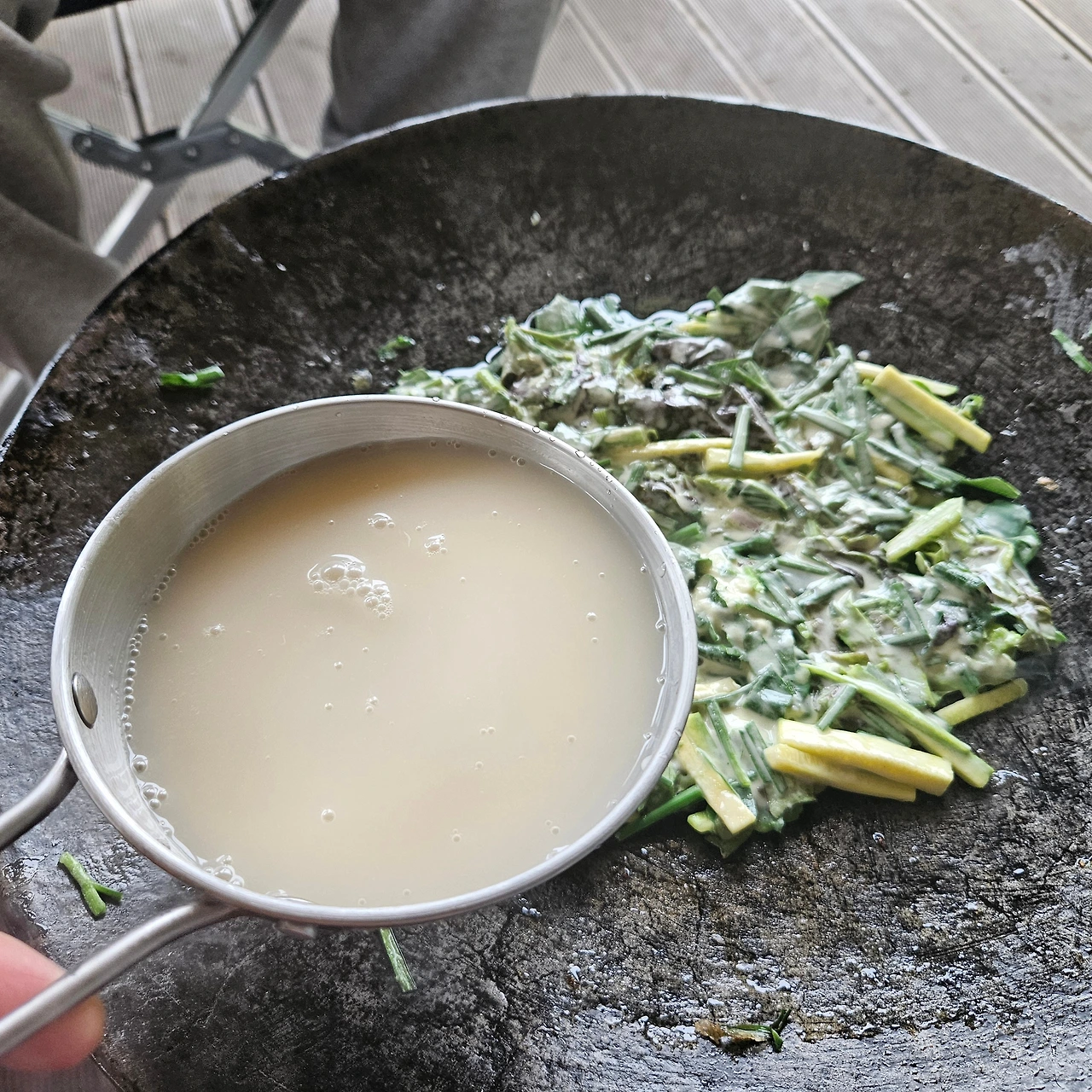 남편은 짐정리를 하고 나는 부추를 자르고 상추를 뜯어 지짐이를 구웠다. 지짐이를 젓가락으로 쭈우욱 찢어 입에 넣었다. 아삭아삭 씹히는 상추 전의 맛이 별미다. 젖샘 막걸리를 들이켰다. 텁텁하면서도 구수한 맛은 어린 시절 아버지 심부름을 하며 맛보던 그 막걸리 맛이다.