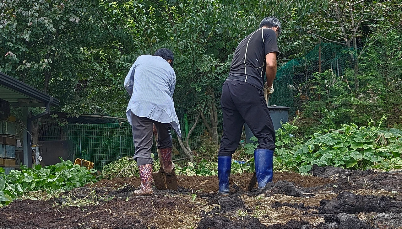 농사 경험이 없는 남편은 삽질하는 것을 유난히 힘들어했다. 아내는 그것을 알기에 조금이라도 삽질을 거들고 싶었다.