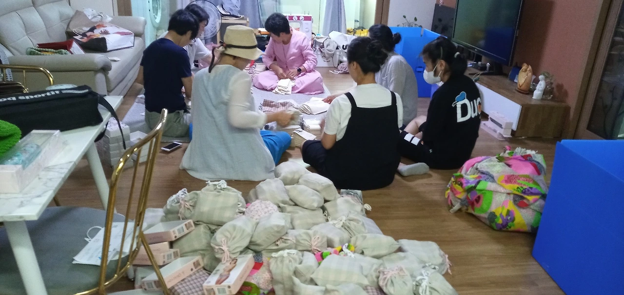 달맞이 회원들이 모여 틈틈이 만든 생리대 포장작업하고 있다.