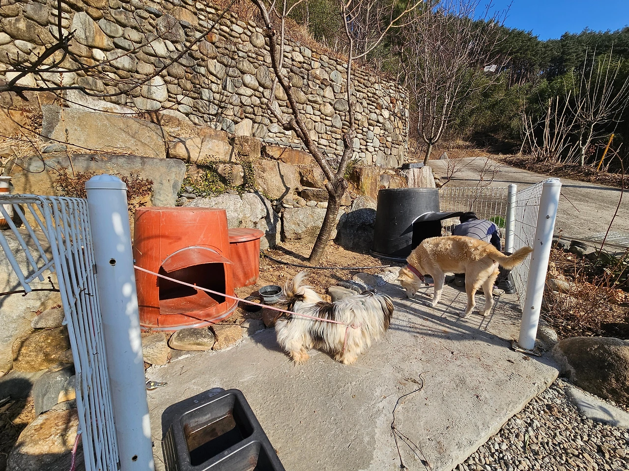 우리 집에는 두 마리의 개가 있다. 마당에 풀어놓고 키우고 싶었으나 마을을 돌아다니며 이웃 굿당에 가서 차려 놓은 제상을 망가뜨린 후 묶이는 신세가 되었다. 개집은 호수가 내려다 보이는 전망 좋은 곳에 패널집을 지어 주었다. 4년 넘게 한 곳에서 키웠더니 털갈이하며 빠진 털과 매일 싸 대는 오줌이 쌓여서 찌든 내가 진동했다. 특히 장마철이 되면 냄새가 아주 고약했다.