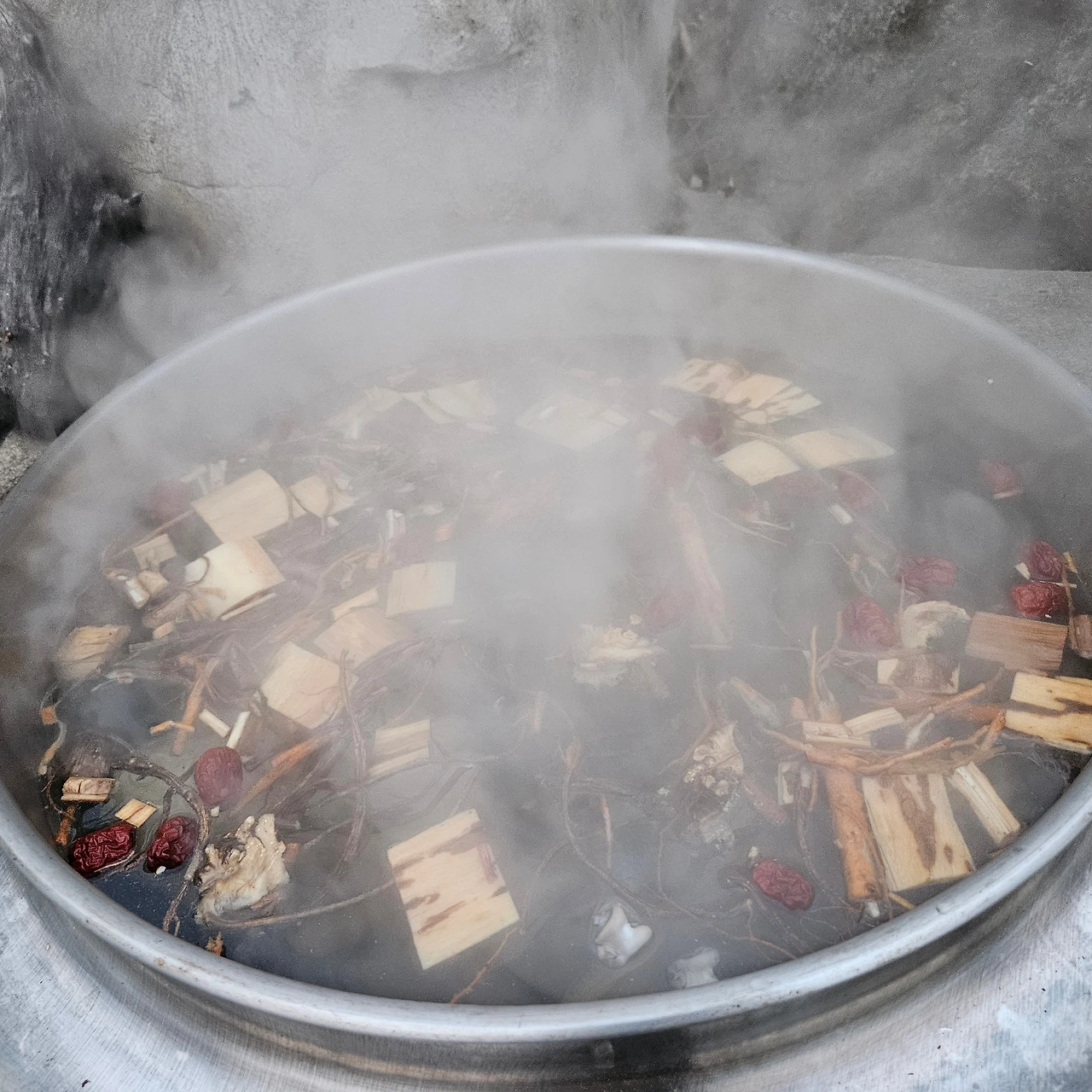 잡내를 제거하기 위해 물에 담가 두고 커다란 솥에 약초를 넣고 불을 땠다. 노계이고 풀어 키운 닭이라 살이 질기다. 첫날은 4시간 이상 삶았다. 하룻밤 뜸을 들인 후 또 2시간 불을 땠다.