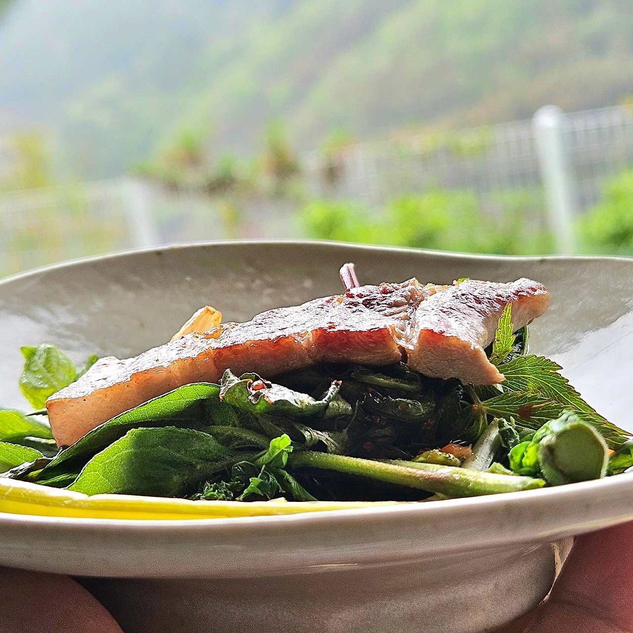 땀 흘린 뒤에 먹는 산나물 쌈에 얹은 삼겹살 한 점과 시원한 맥주 한 잔에 세상이 다 내 것 인양 행복하다.