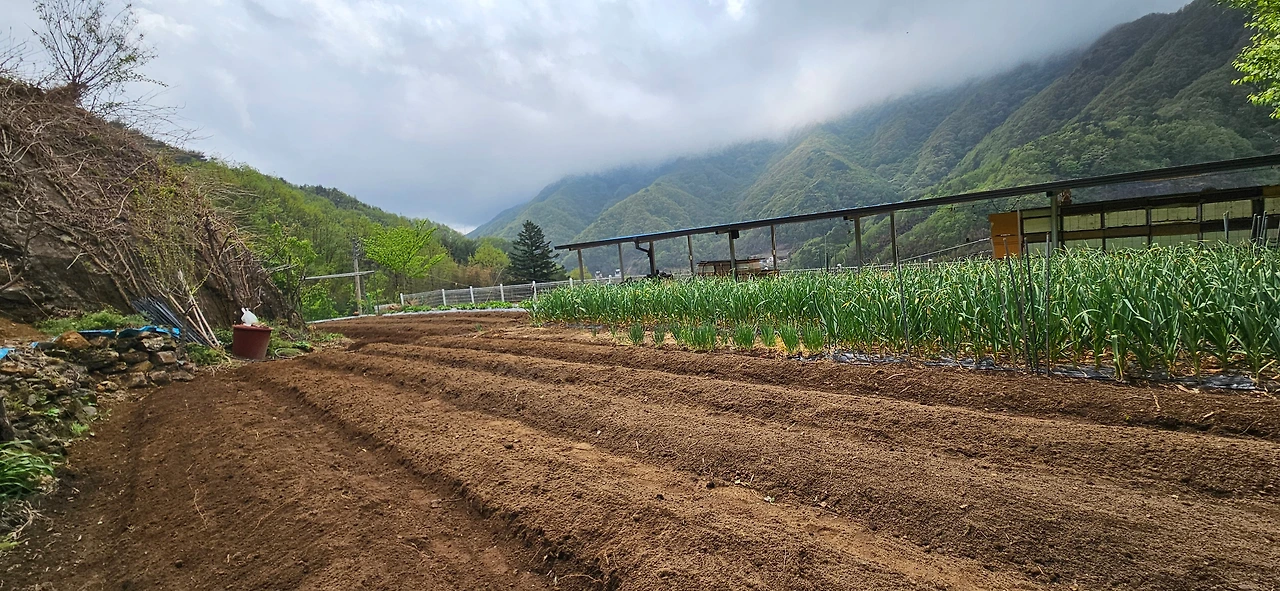 사진을 찍는데 남편은 더워지기 전에 밭에 거름을 뿌리고 흙을 뒤집어야 한다며 서두른다.