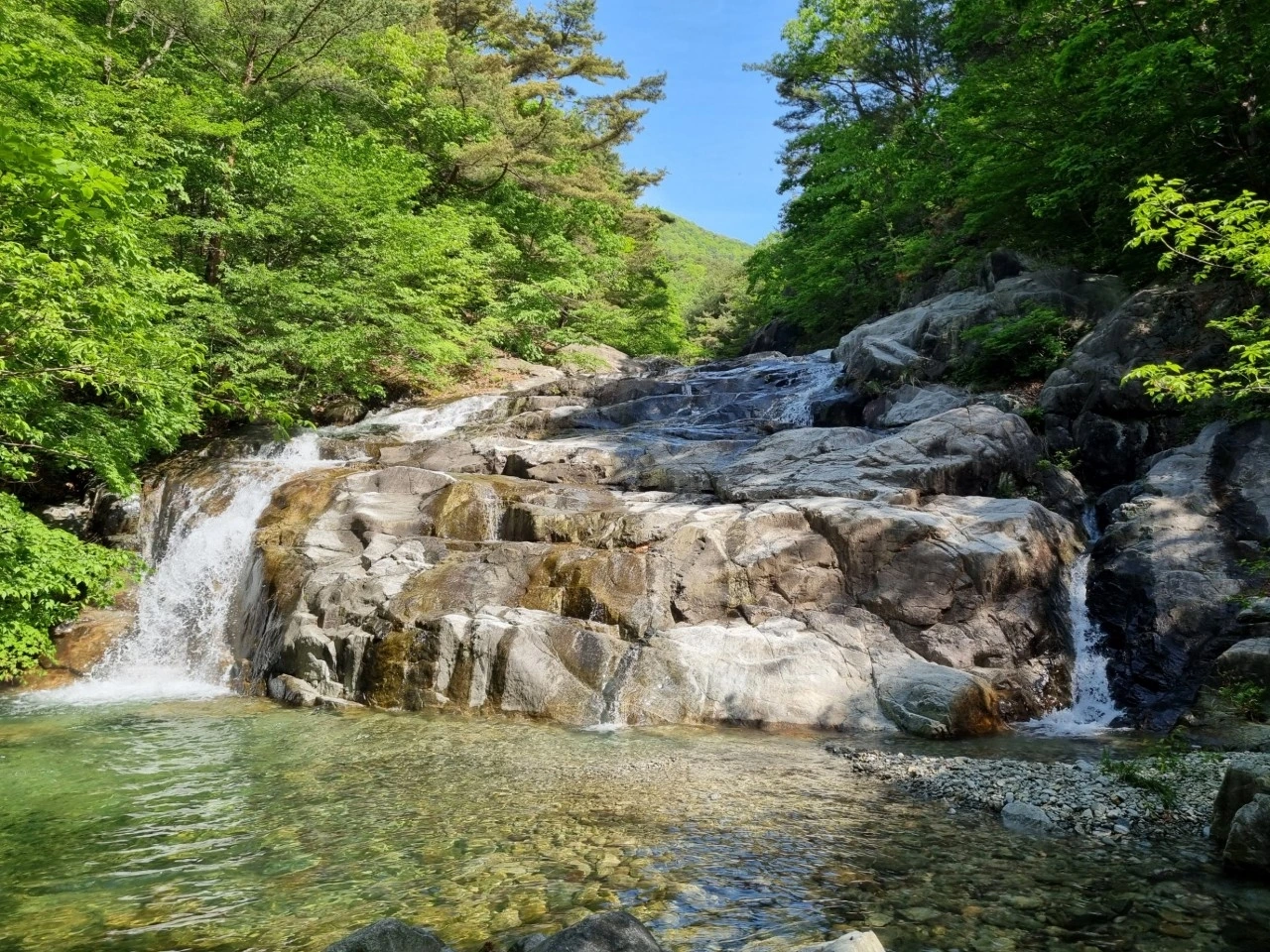 햇살은 바위에 부딪히며 바사삭 하얀빛을 뿌리고, 수정보다 맑은 물은 빛을 깨트리며 파동을 일으킨다. 나뭇잎 사이를 스치는 바람 소리와 풀벌레 울음소리는 자연이 만든 협주곡이다.