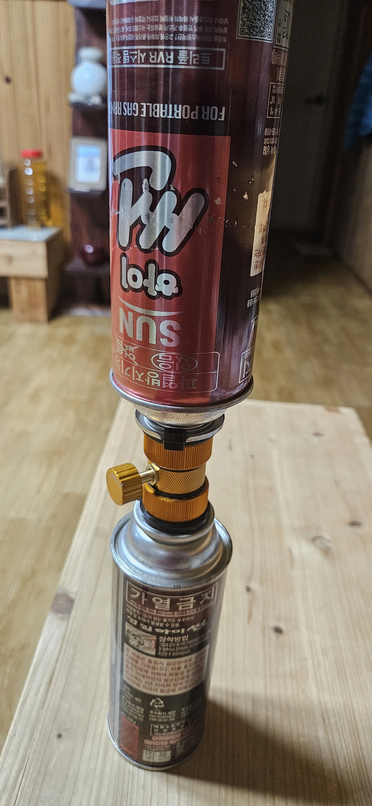 그동안 아깝다고 버리지 못한 빈 통들을 가져와 도구를 가운데 두고 두 통을 연결했다. 위쪽의 가스가 아래쪽으로 천천히 이동했다.