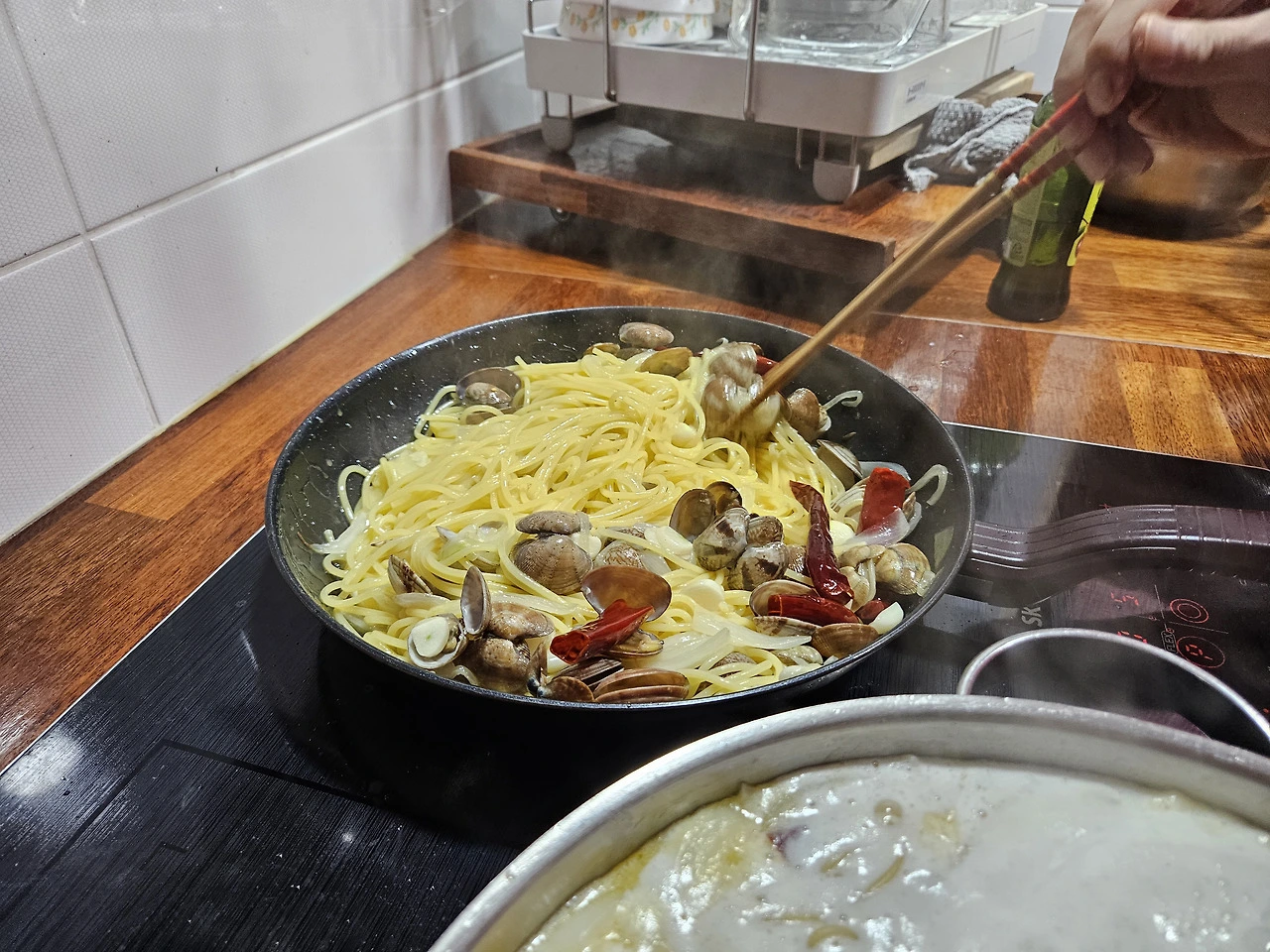 올리브유에 마늘, 조개와 새우를 볶는 냄새가 주방을 가득 채운다.
