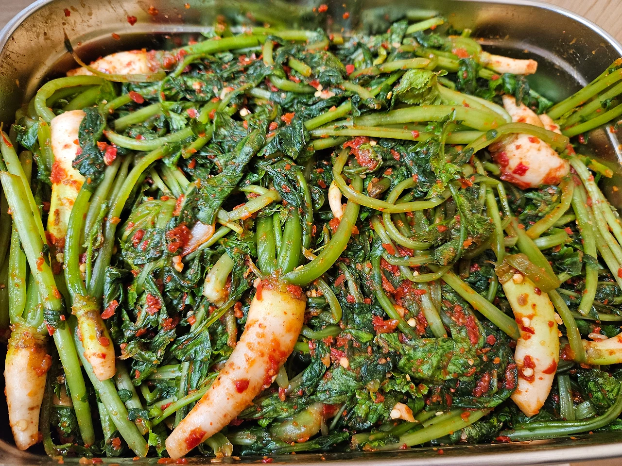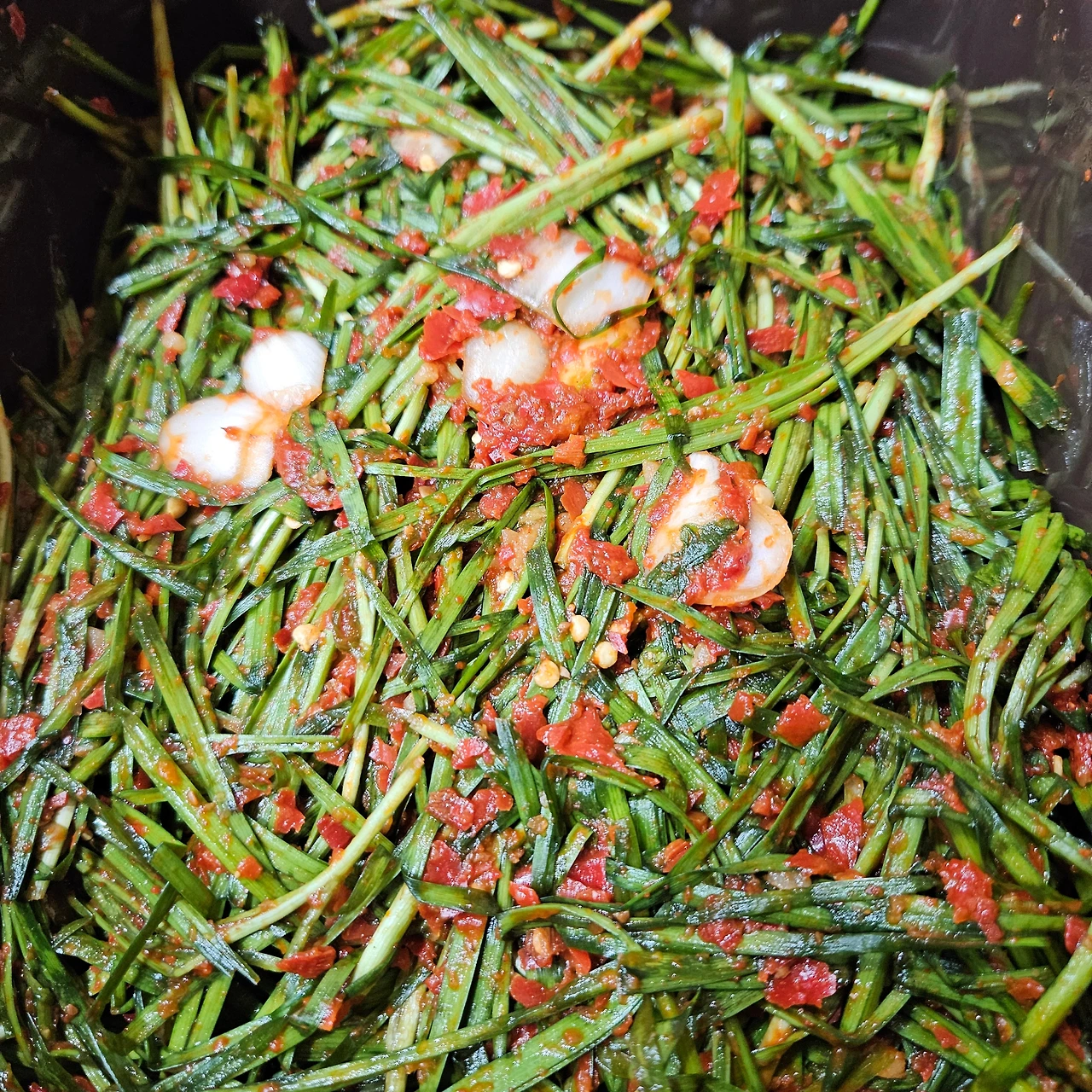 준비한 재료를 분쇄기에 갈아 양념을 만들어 버무렸다. 양푼에서 채소에 양념이 스며들어 숨이 죽기를 기다려 다시 한번 더 버무렸다. 두 통의 김치통에 차곡차곡 담았다.