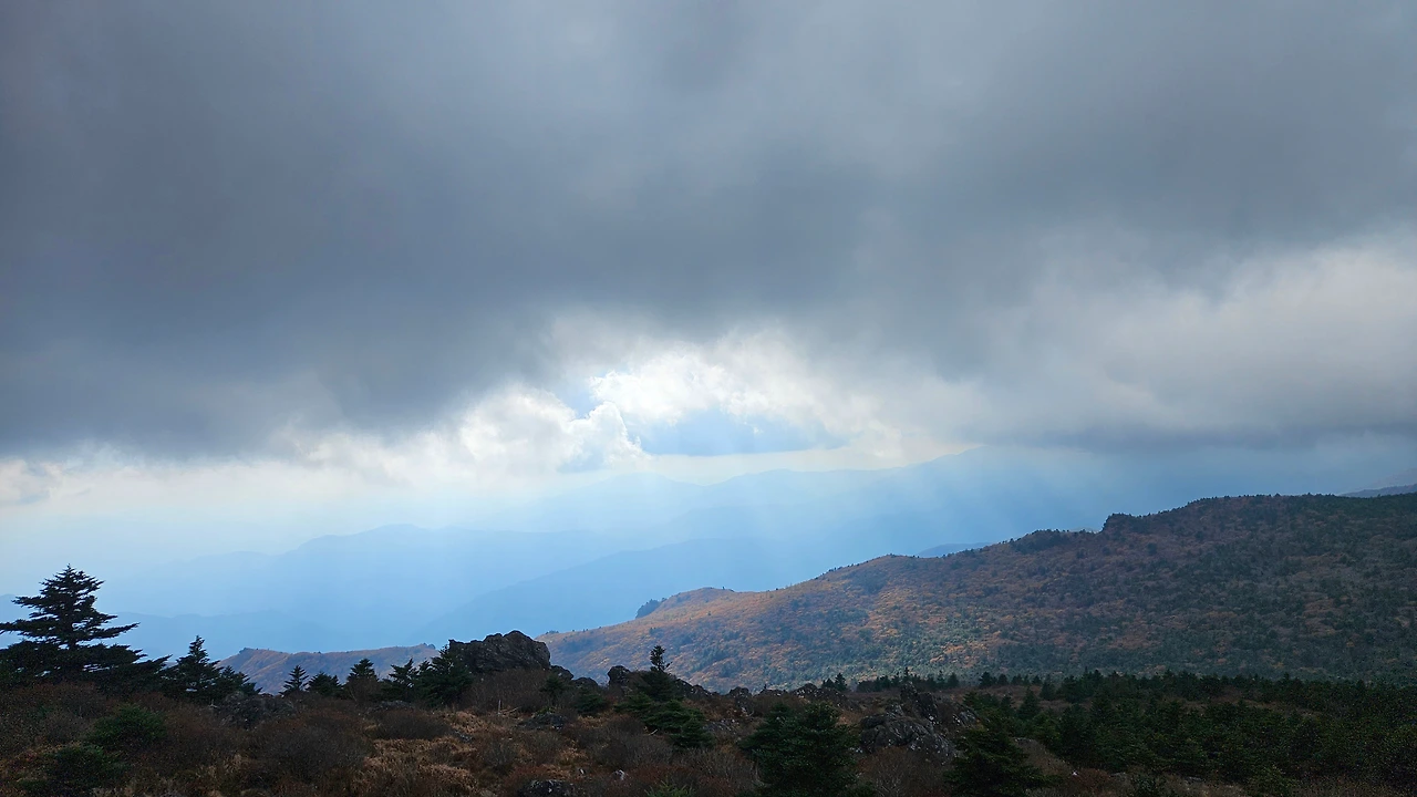 촛대봉에서 바라본 세석평전엔 먹구름이 낮게 내려앉았다.