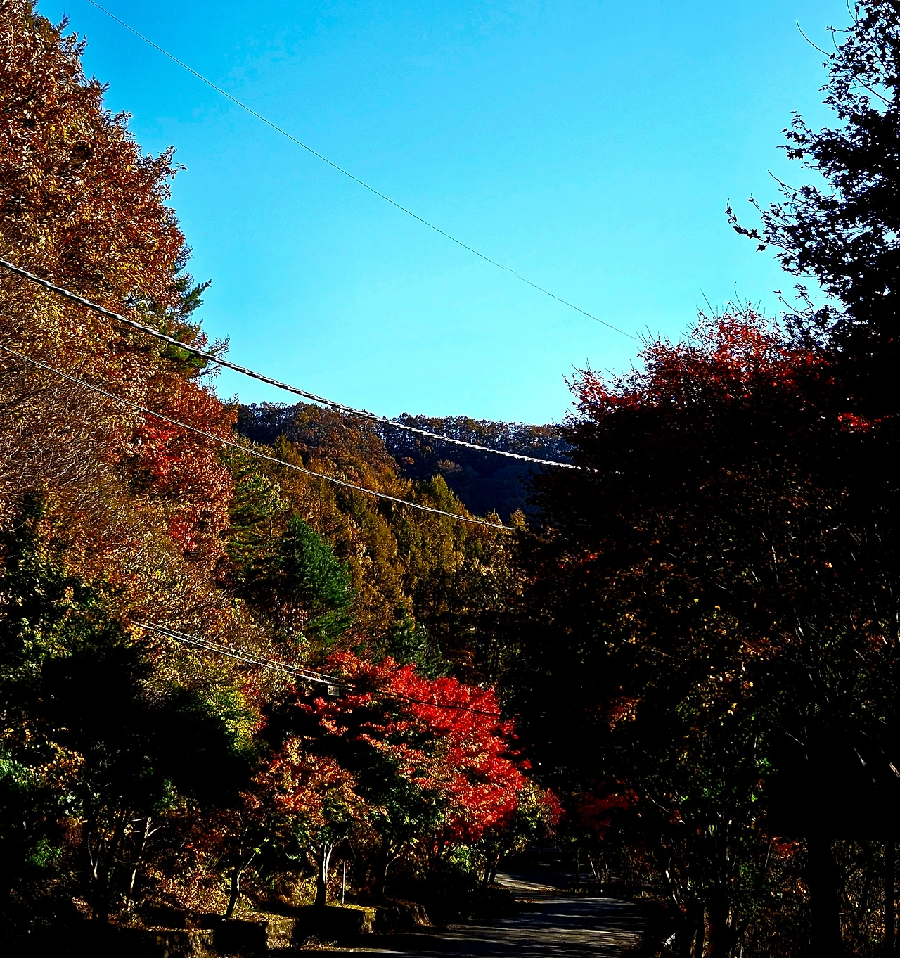호수로 가는 길은 경사가 심하고 꼬불꼬불하다. 양쪽으로는 애기 단풍나무가 심어져 있다. 도로가의 나무들은 햇살이 닿는 곳에만 단풍이 들었다.