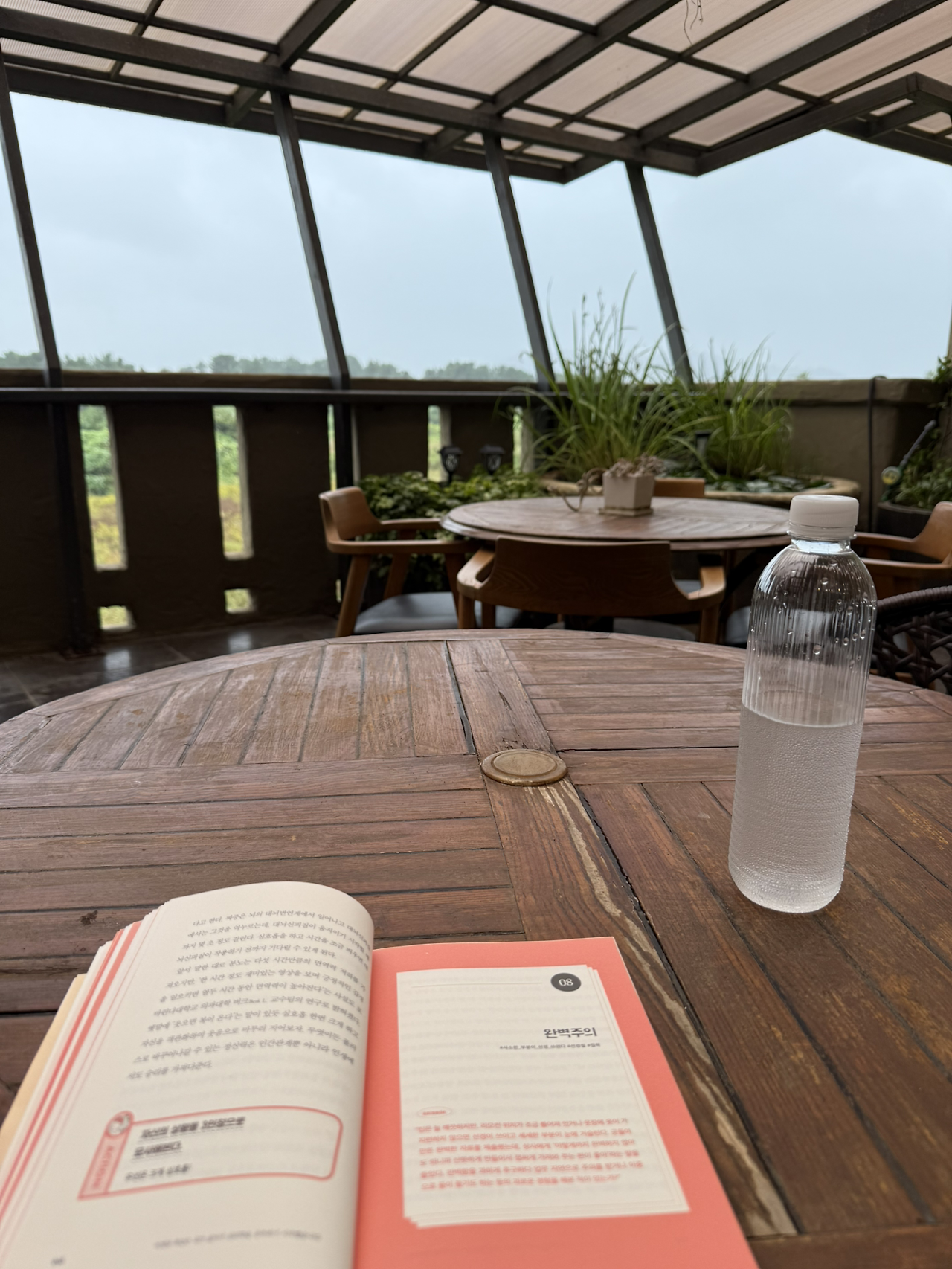 오후에는 폭우가 내리길래 책을 들고 테라스로 나갔습니다. 이렇게 빗소리를 집중해서 들어본 건 처음인 것 같아요. 일상에서는 비가 오면 표정이 구겨지면서 짜증 나는 감정이 컸었는데, 빗소리를 집중해서 들어보니 마음이 편해지는 감정이 나타나더라고요. 내가 사물을 어떻게 바라보는지에 따라서 확연하게 달라지는 감정에 대해서 깨우칠 수 있었어요. 매 순간 부정적인 감정은 최대한 덜어내고 싶은데 참 어렵습니다.