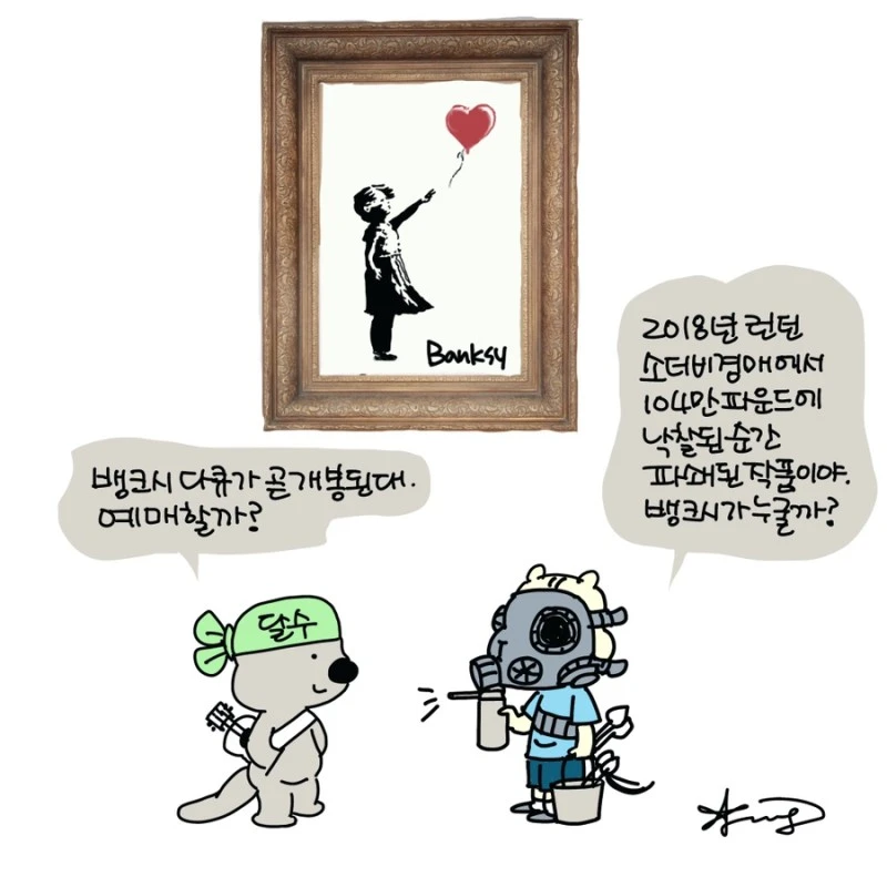 2018년 런던 소더비 경매장에서 한화로 15억정도에 낙찰되었을때 작가에 의해서 파쇄된 작품으로 논란이 많았던 베일에 싸인 작가, 뱅크시.