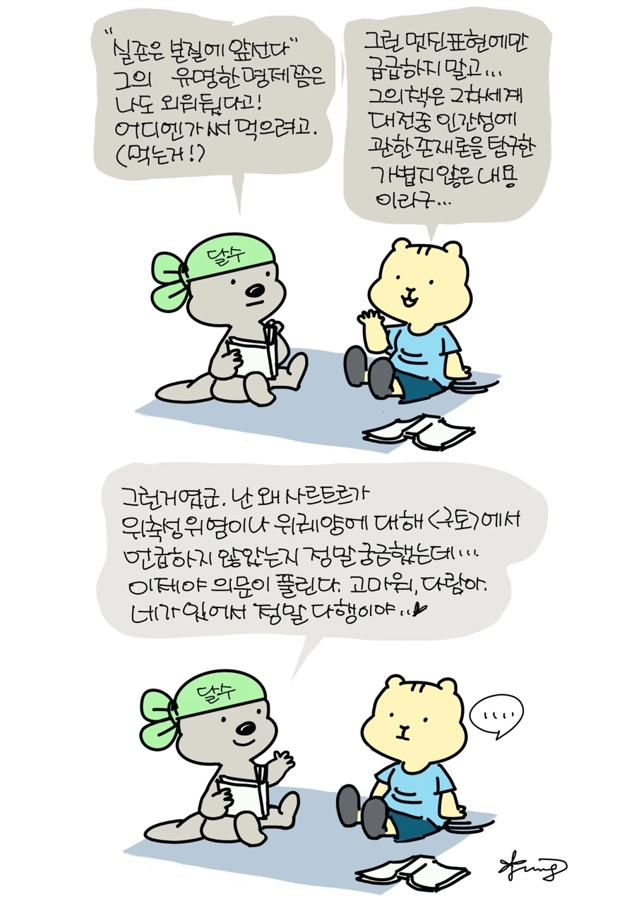 「다람이와 달수」 그립니다. 다람이는 다람쥐, 달수는 수달이고 농담속 한줄 인문학을 컨셉으로 그리는 만화 입니다.