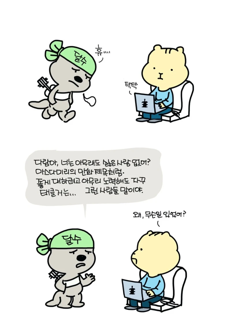 「다람이와 달수」 그립니다. 다람이는 다람쥐, 달수는 수달이고 농담속 한줄 인문학을 컨셉으로 그리는 만화 입니다.