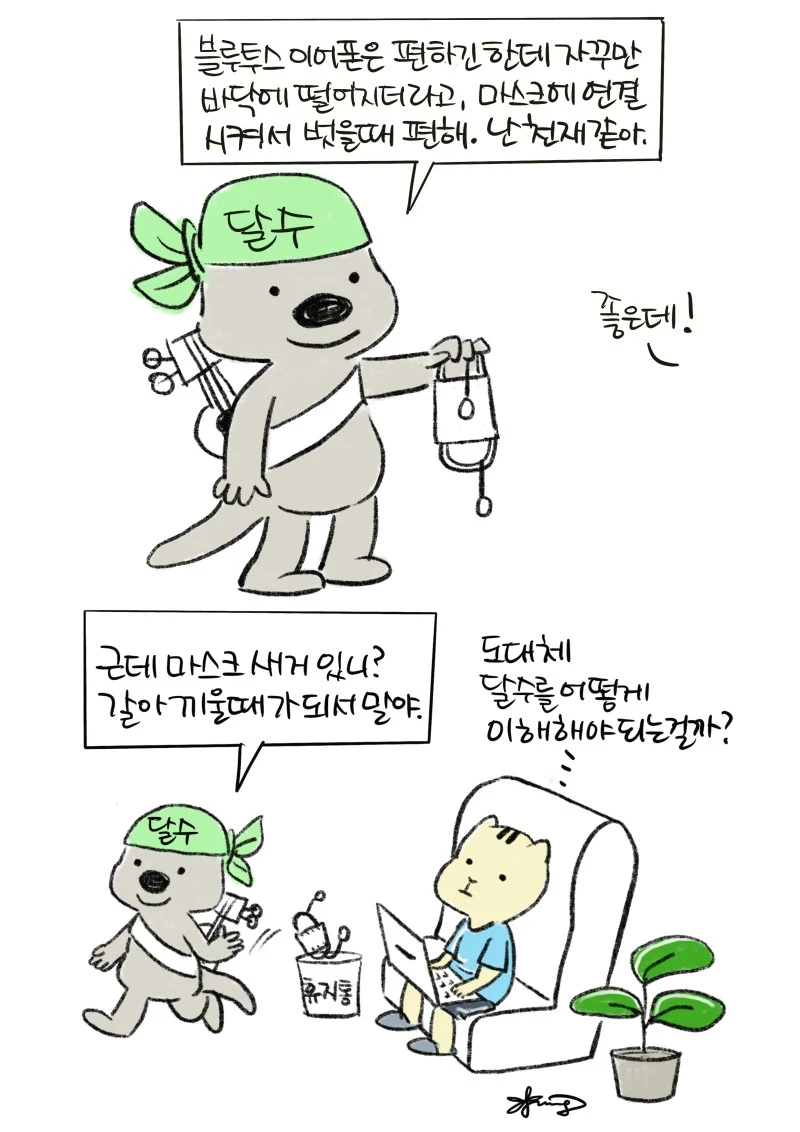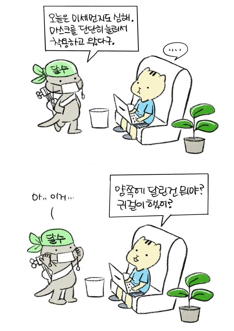 「다람이와 달수」 그립니다. 다람이는 다람쥐, 달수는 수달이고 농담속 한줄 인문학을 컨셉으로 그리는 만화 입니다.