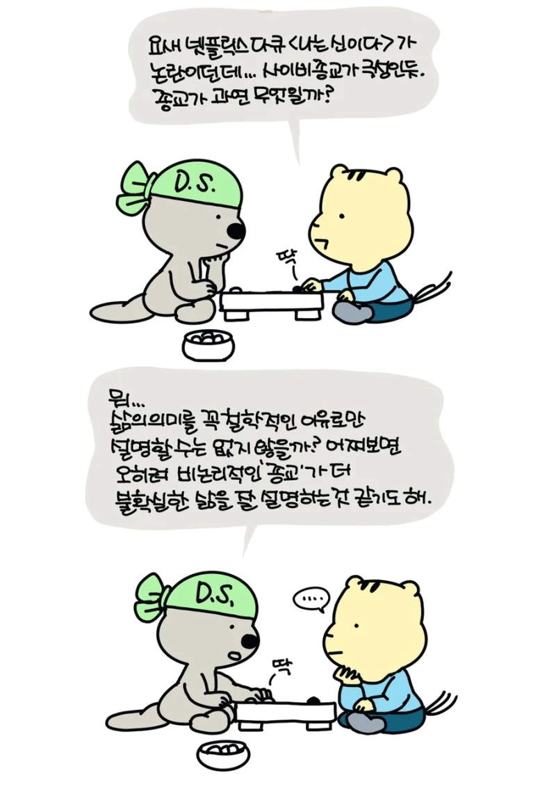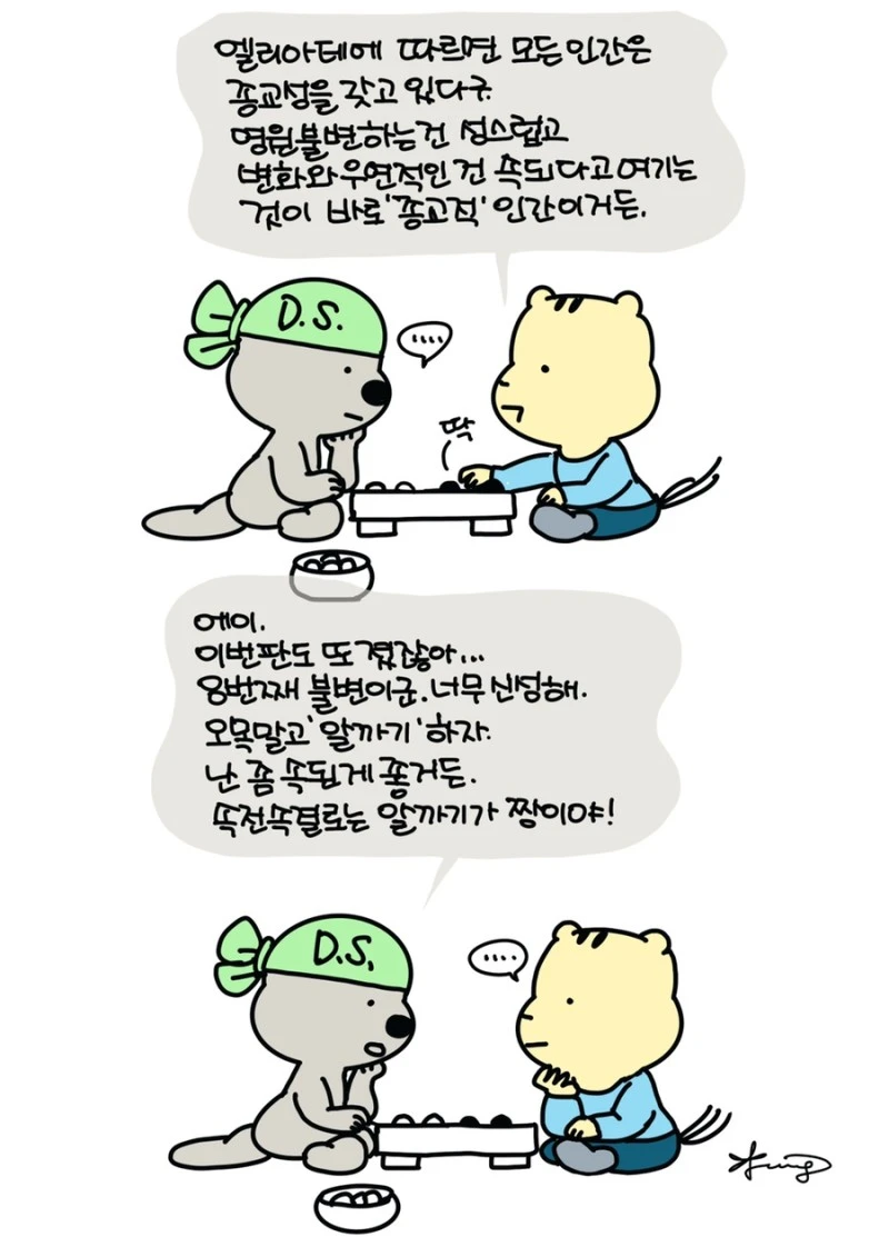 「다람이와 달수」 그립니다. 다람이는 다람쥐, 달수는 수달이고 농담속 한줄 인문학을 컨셉으로 그리는 만화 입니다.