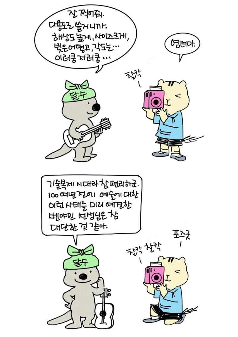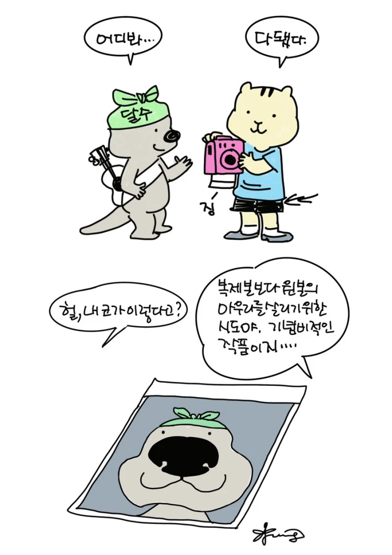 「다람이와 달수」 그립니다. 다람이는 다람쥐, 달수는 수달이고 농담속 한줄 인문학을 컨셉으로 그리는 만화 입니다.